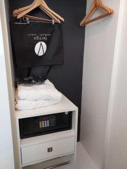 Teil des Schranks mit Safe, Bademänteln und Slippern