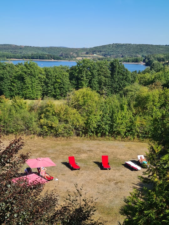 Blick vom Zimmer auf die Liegewiese mit See im Hintergrund