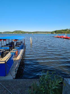 Lagoliner (Wassertaxi) am See und Anleger Tretboote