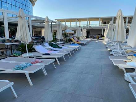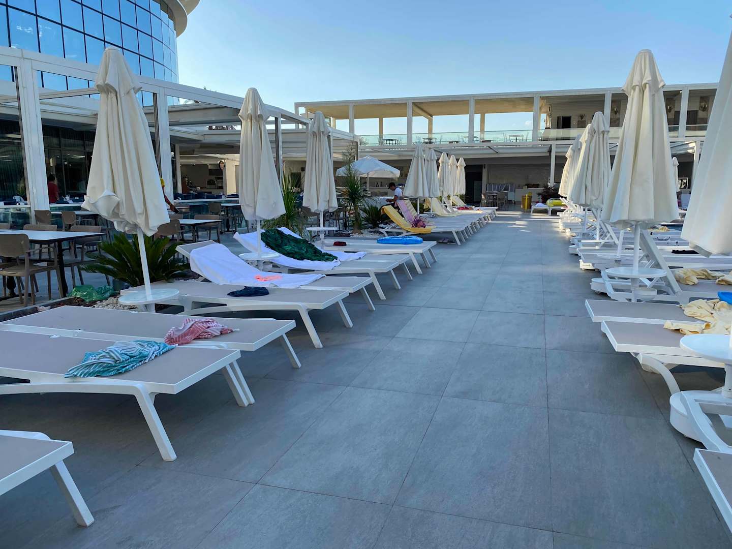 So sah es morgens um 7.30 Uhr rund um den Pool aus. Ab 8 Uhr bekommt man keine Liegen mehr 😡