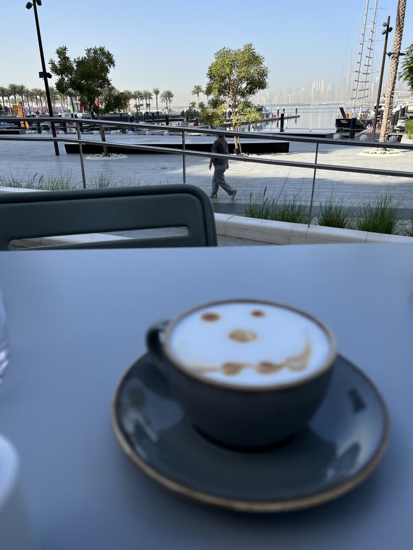 Frühstück draußen mit Blick auf den Yachthafen