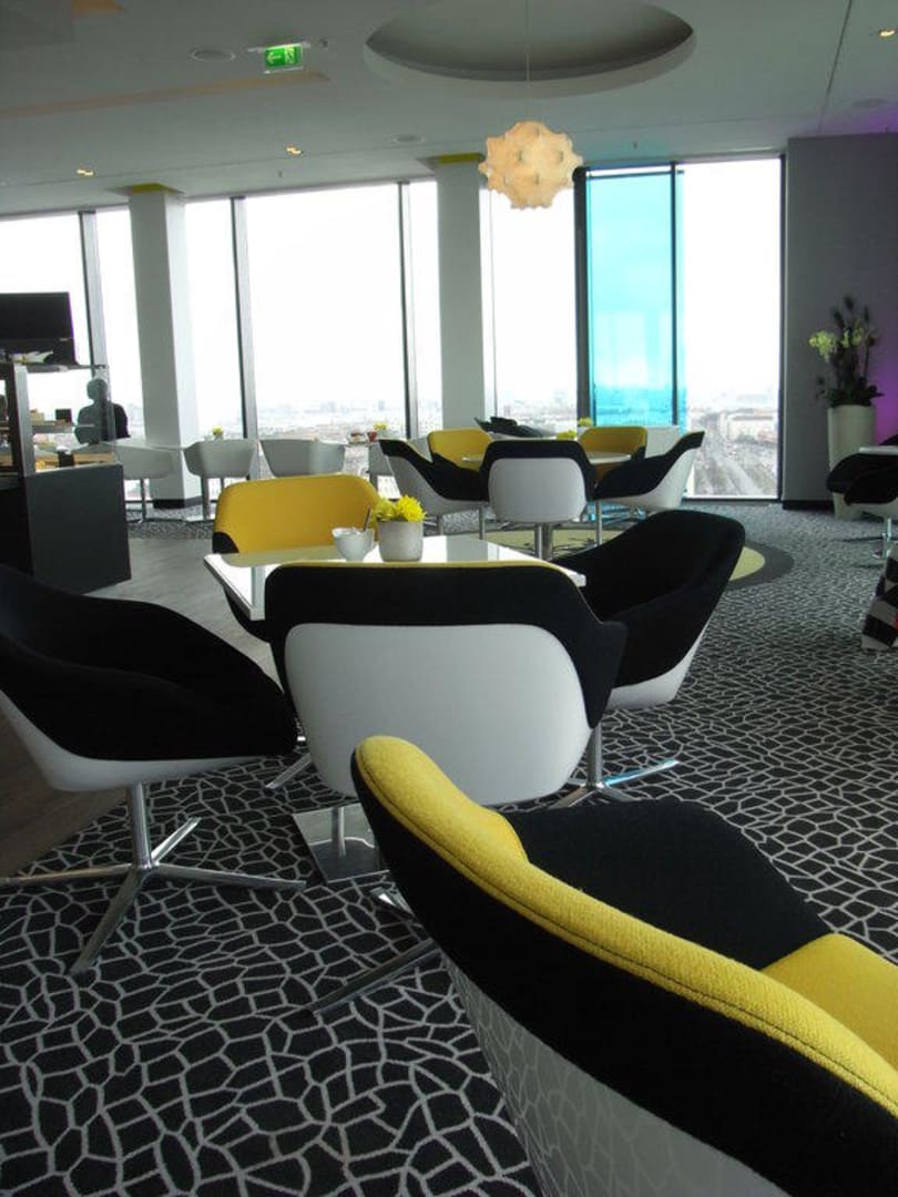 Blick in das Sky Café im 12. Stock des Turms mit herrlichem Blick auf Berlin.