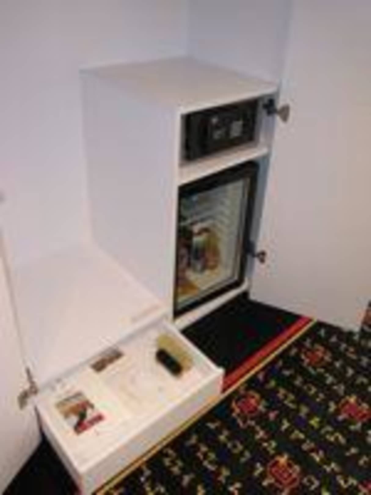 na zdjęciu mini barek, sejf, i szuflada z "niezbędnikiem biznesmena"