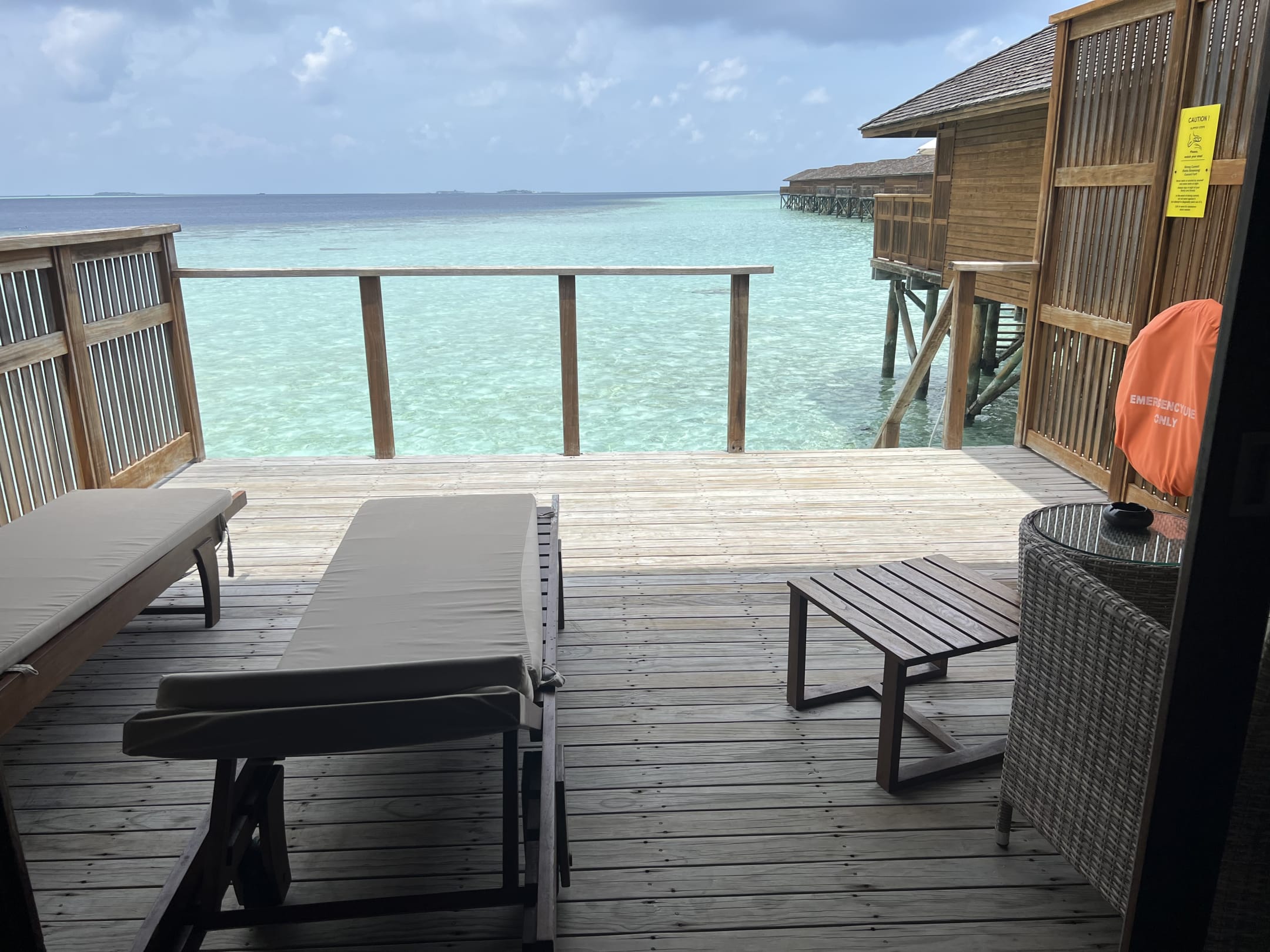 ZimmerHier ist leider kein Sonnenschutz gegeben. Die Sonne wandert dann den Tag über. Leider sind die Liegen dann unbrauchbar.