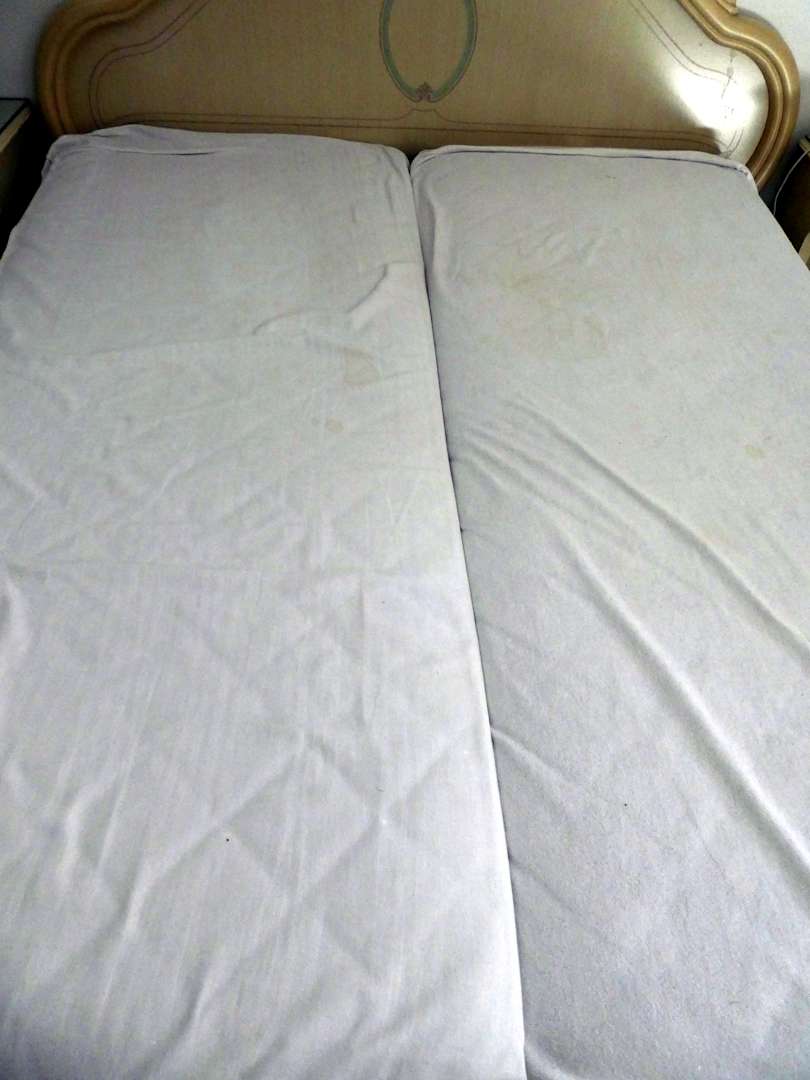 "Matratzenschoner" , der aus 2 ausgeleierten von Flecken übersähten leintüchern besteht