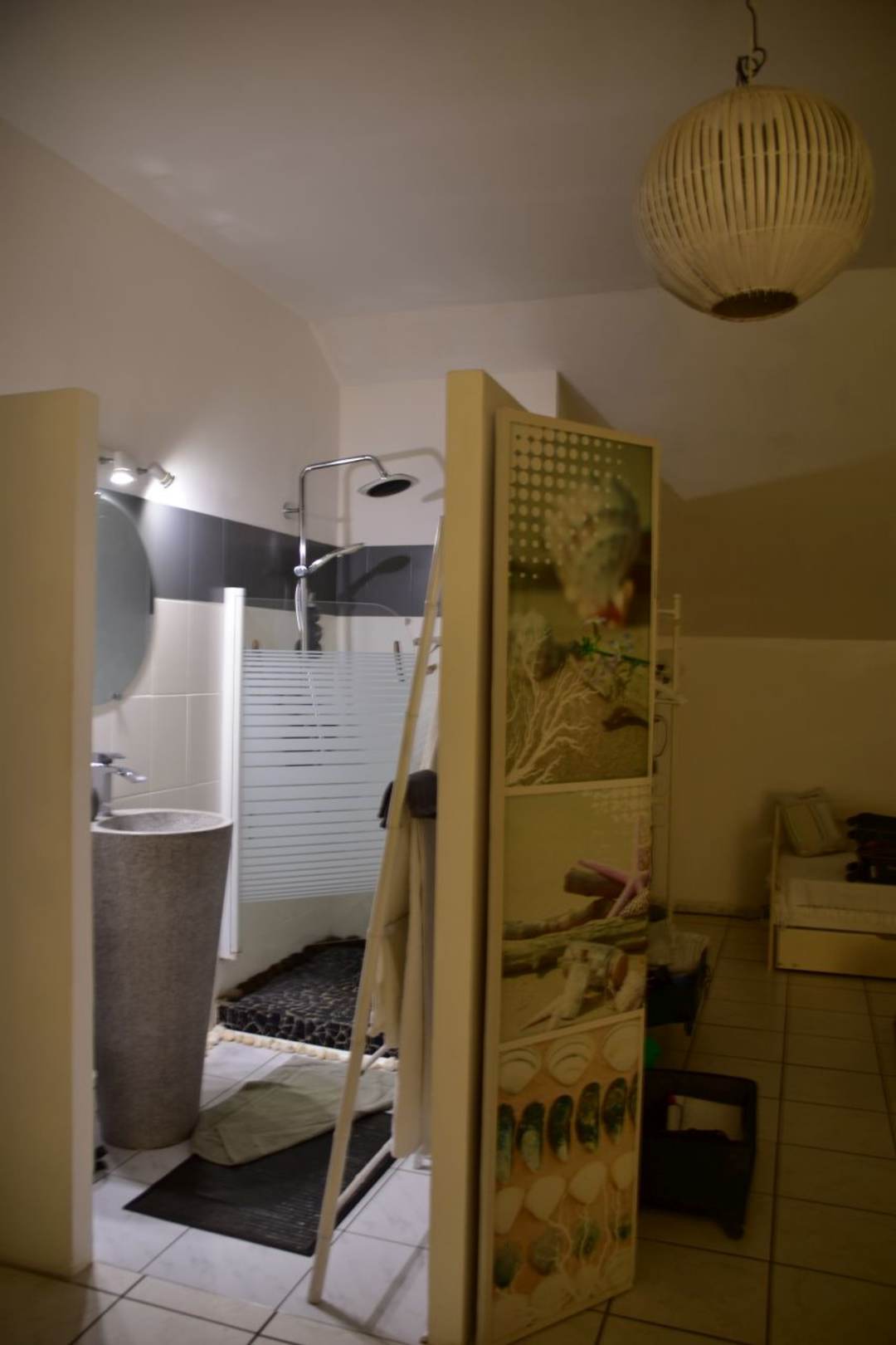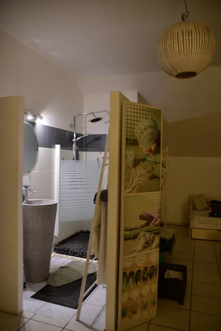 in das Zimmer halboffen integriertes Bad