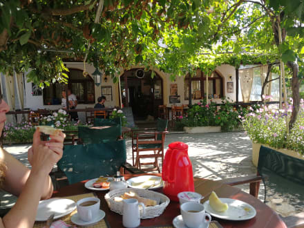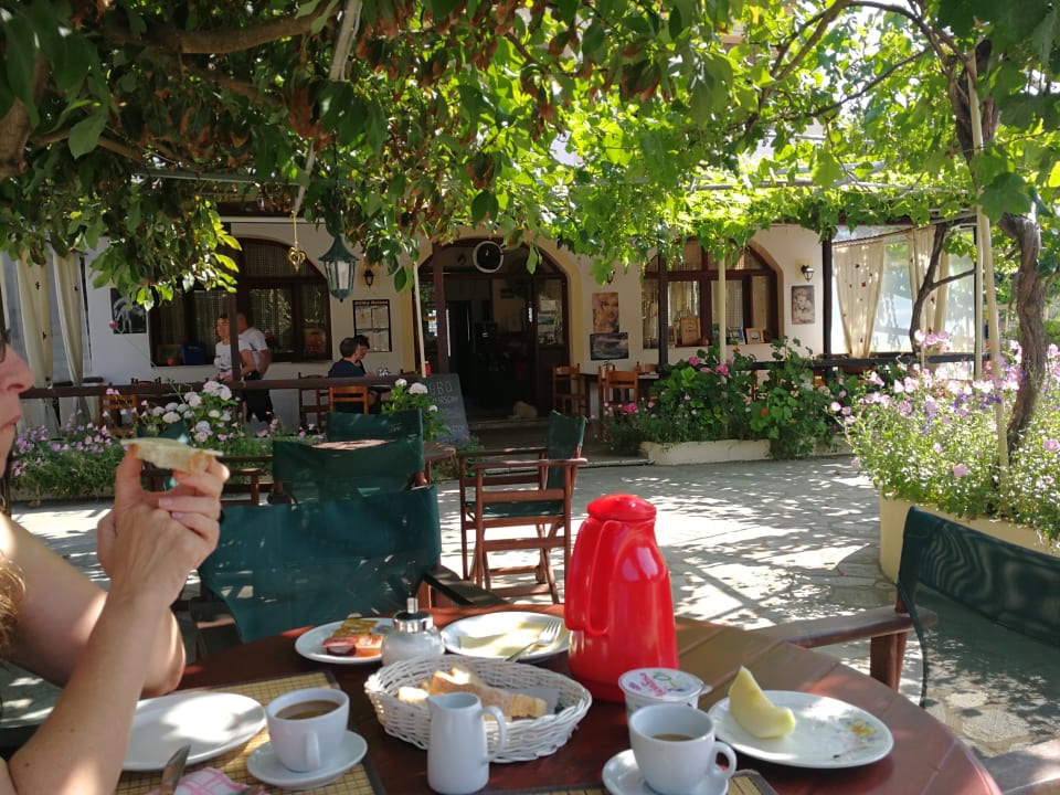 GastroTische unter den Weinreben, hier beim Frühstück mit Blick auf das Hauptgebäude mit der Taverne