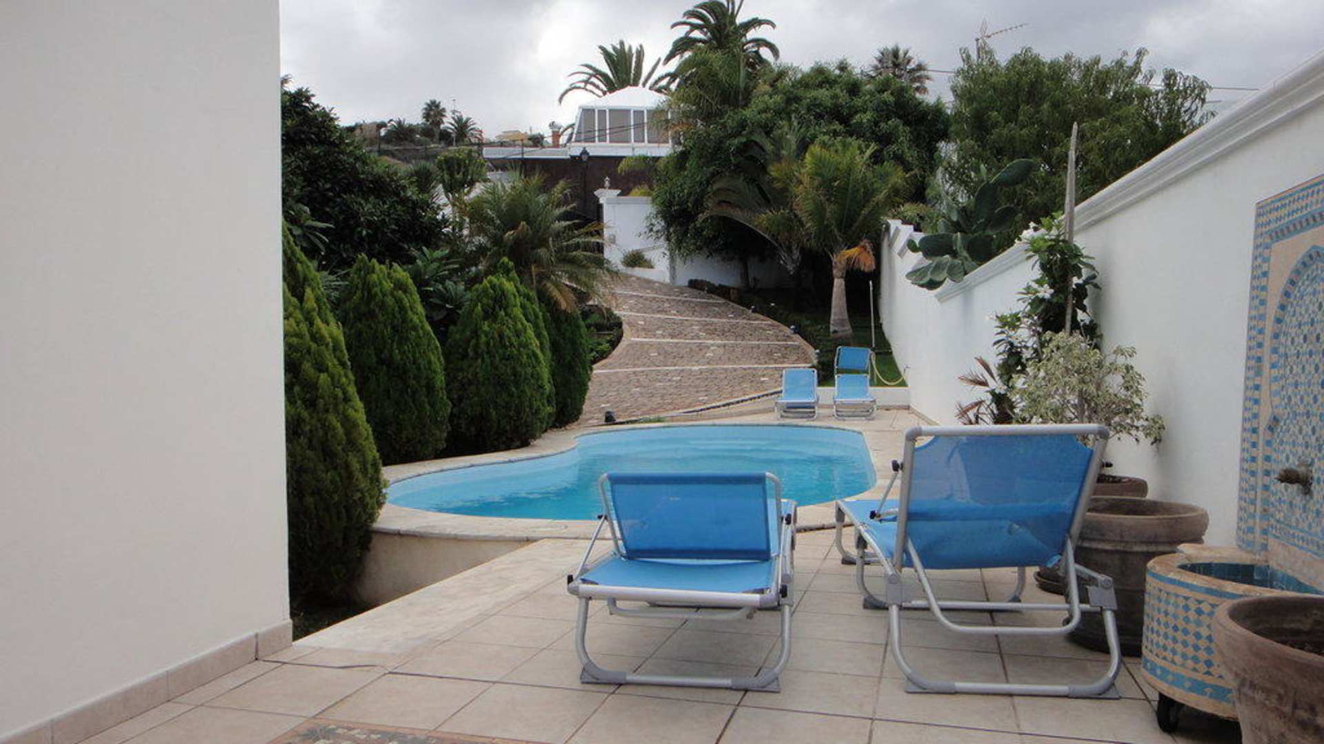 Pool neben Mauer und Auffahrt