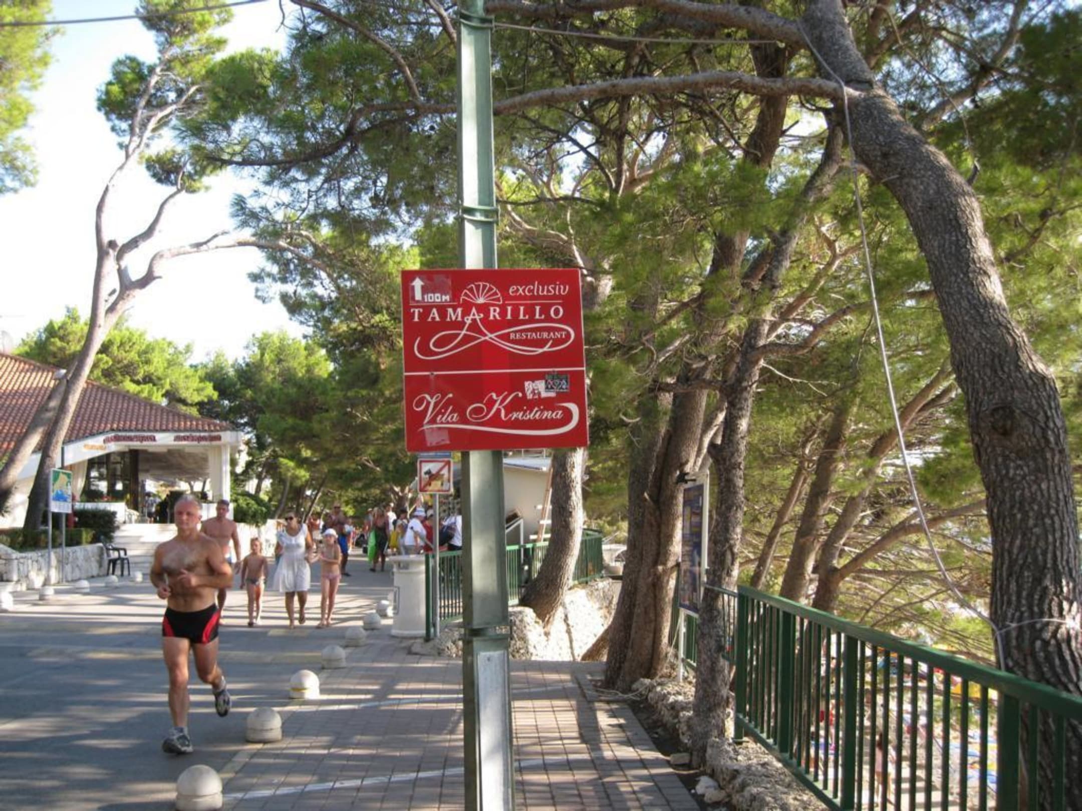 rechts das Meer,links das Hotel Bacchus,geradeaus zum Mittagseesen.siehe Schild
