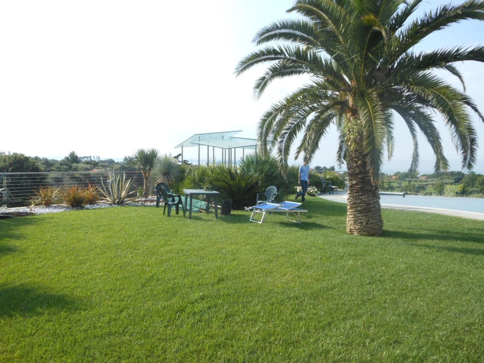 Bereich für die Gäste mit Plastiktisch und Liegen