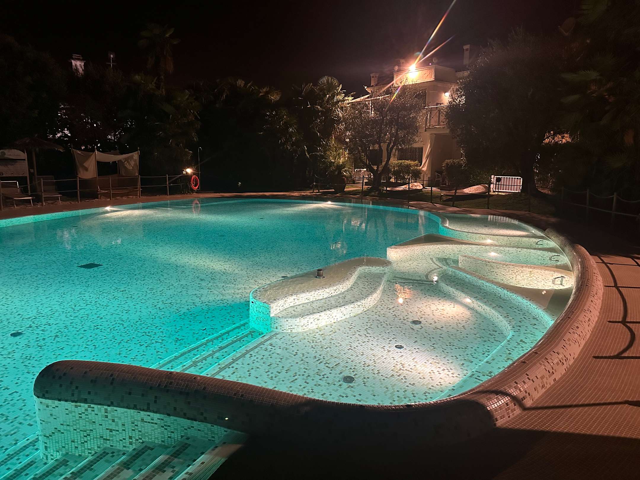 Beleuchteter Pool bei Nacht mit Blubberbecken