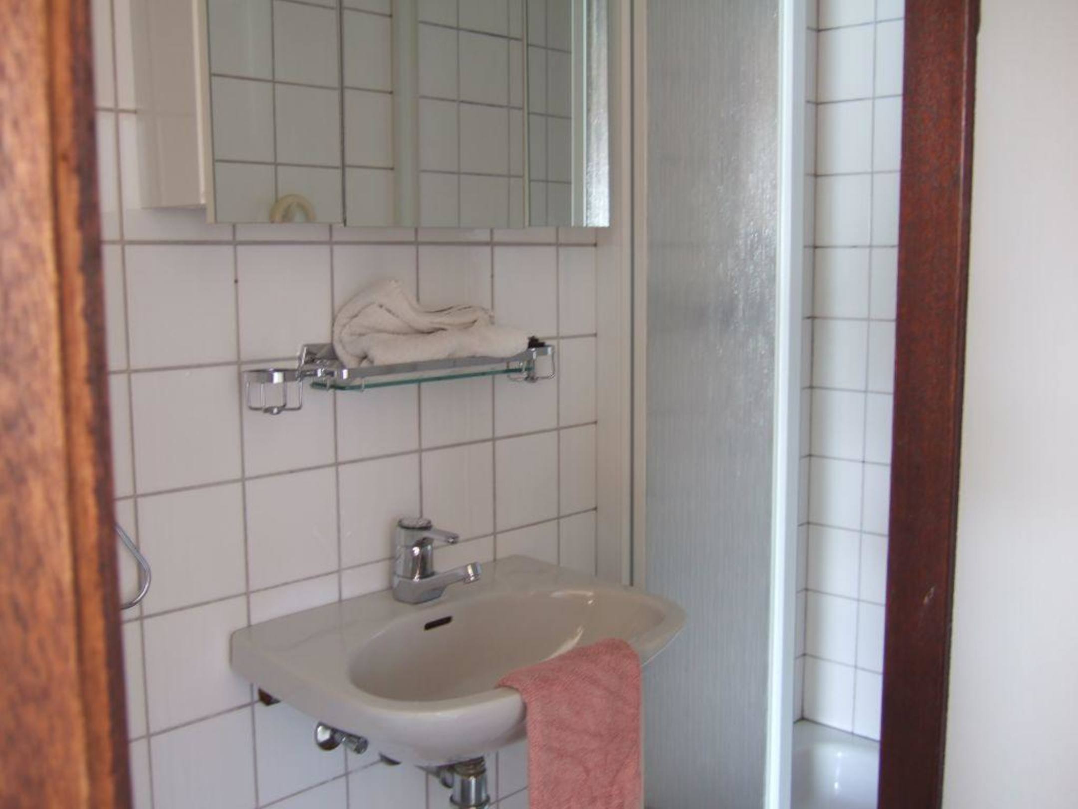 Minibad mit Dusche und WCDas WC befindet sich links hinter der Tür . Es ist sehr eng, wenn man sitzt. Für grössere Menschen sehr unbequem!