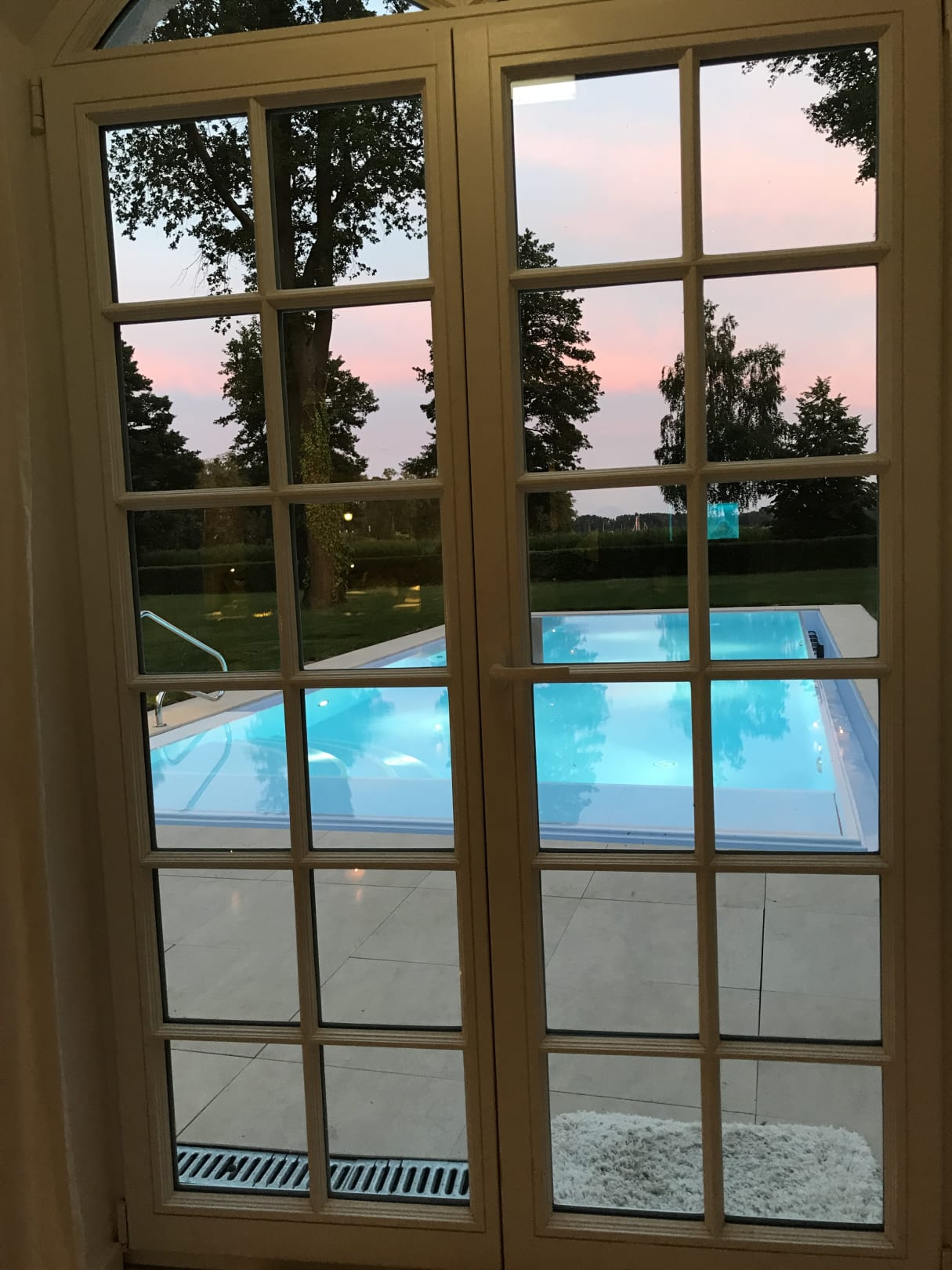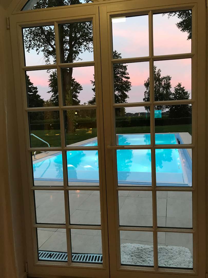 Blick vom Wellnessbereich zum Außenpool