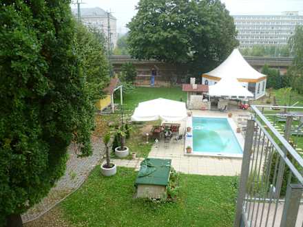 Blick auf Garten, Pool und Eisenbahn