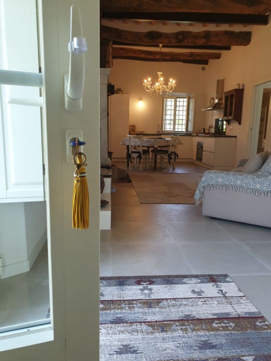 Wohnzimmer mit Küche und historischer Olivenpresse