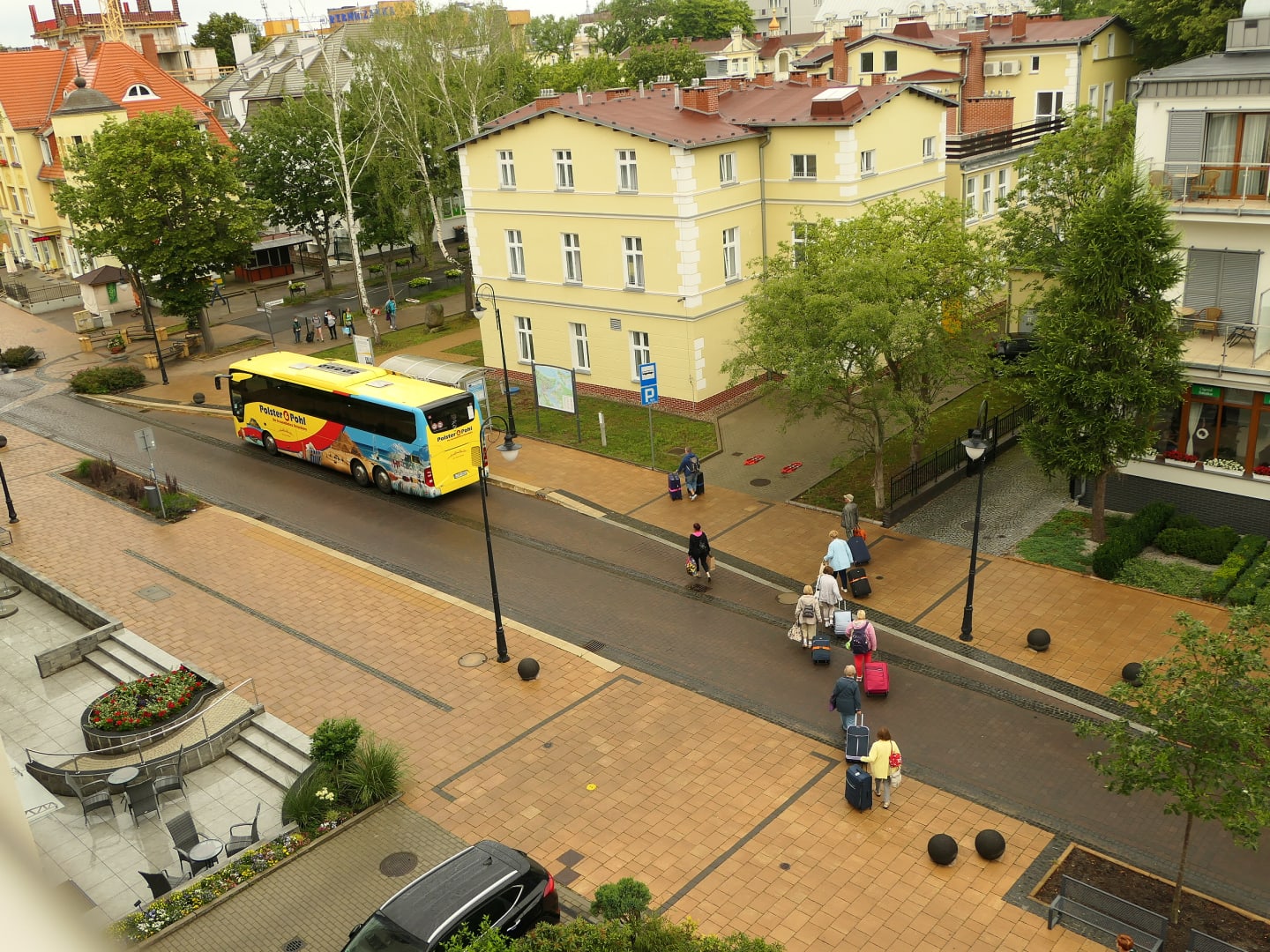 Blick vom Balkon. Es ist gerade Abreise einer Gruppe aus dem Hotel