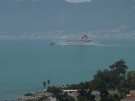 Unbeschreiblich schöne Aussicht von der Terrasse der Villa Didon. Die Villa Didon an einem Berghang in Karthago ist eigentlich ein Hotel; das Restaurant und die Bar sind aber frei zugänglich.