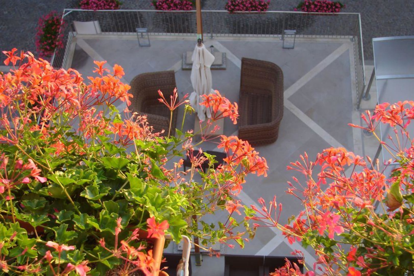 Blick vom Balkon auf einen Teil der Terrasse des Hotels