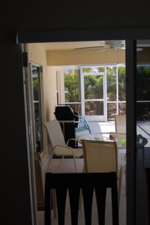 Blick von der Essecke zur Terrasse hinaus auf den Grill