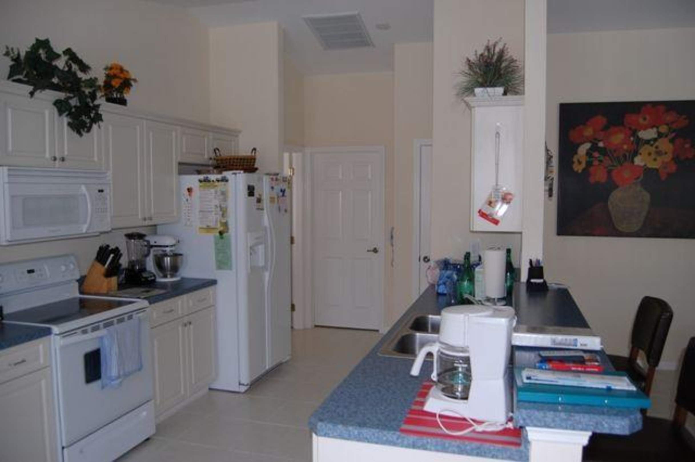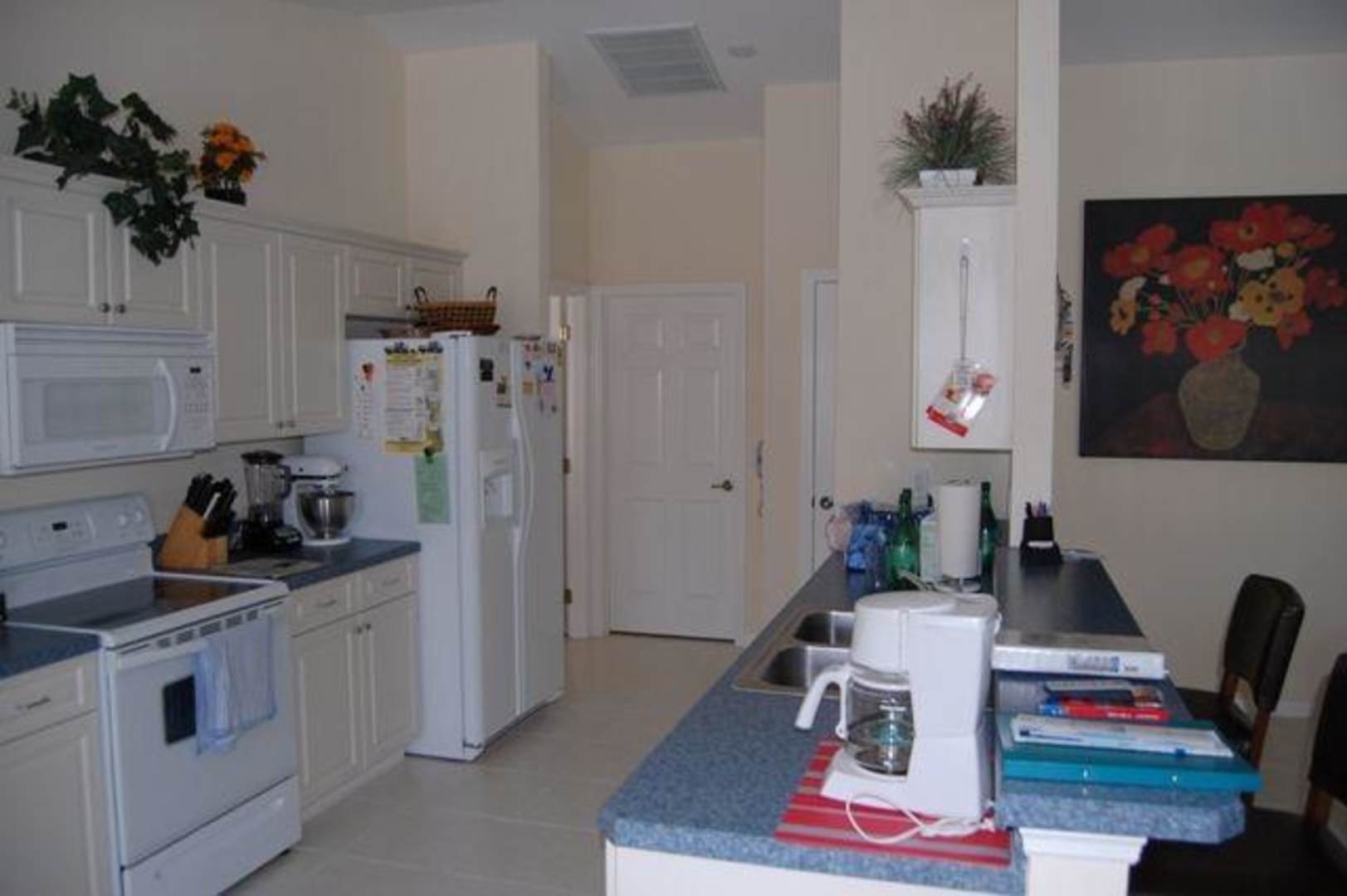 Küche die im Wohnraum intergriert ist und einen riesigen Kühlschrank mit Eiscruscher hat