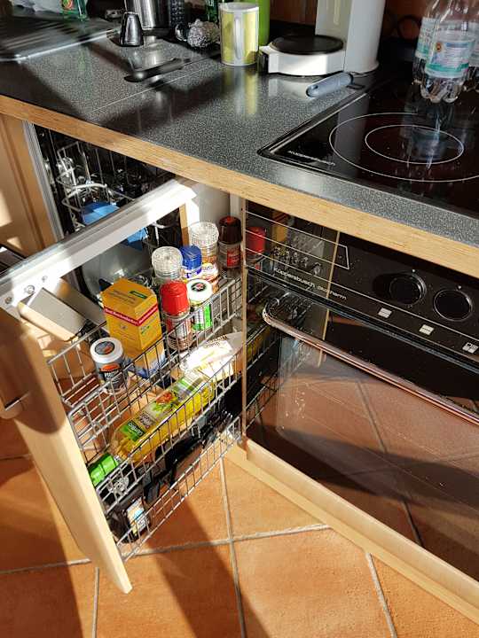 Gewürzregal und Herd.