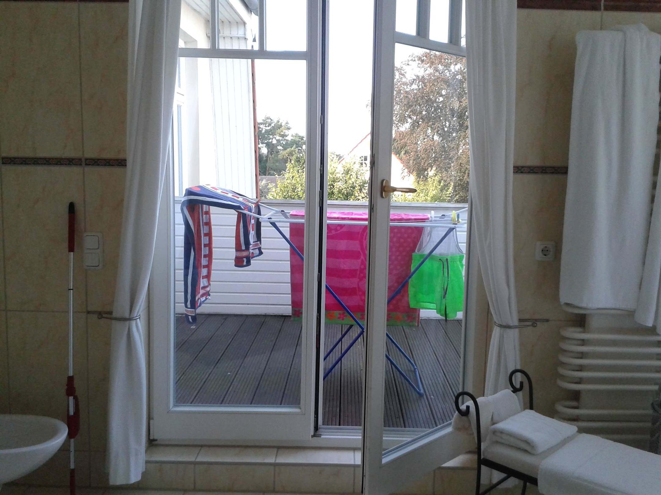 Blick vom Bad, auf die Badterrasse, mit Wäscheständer