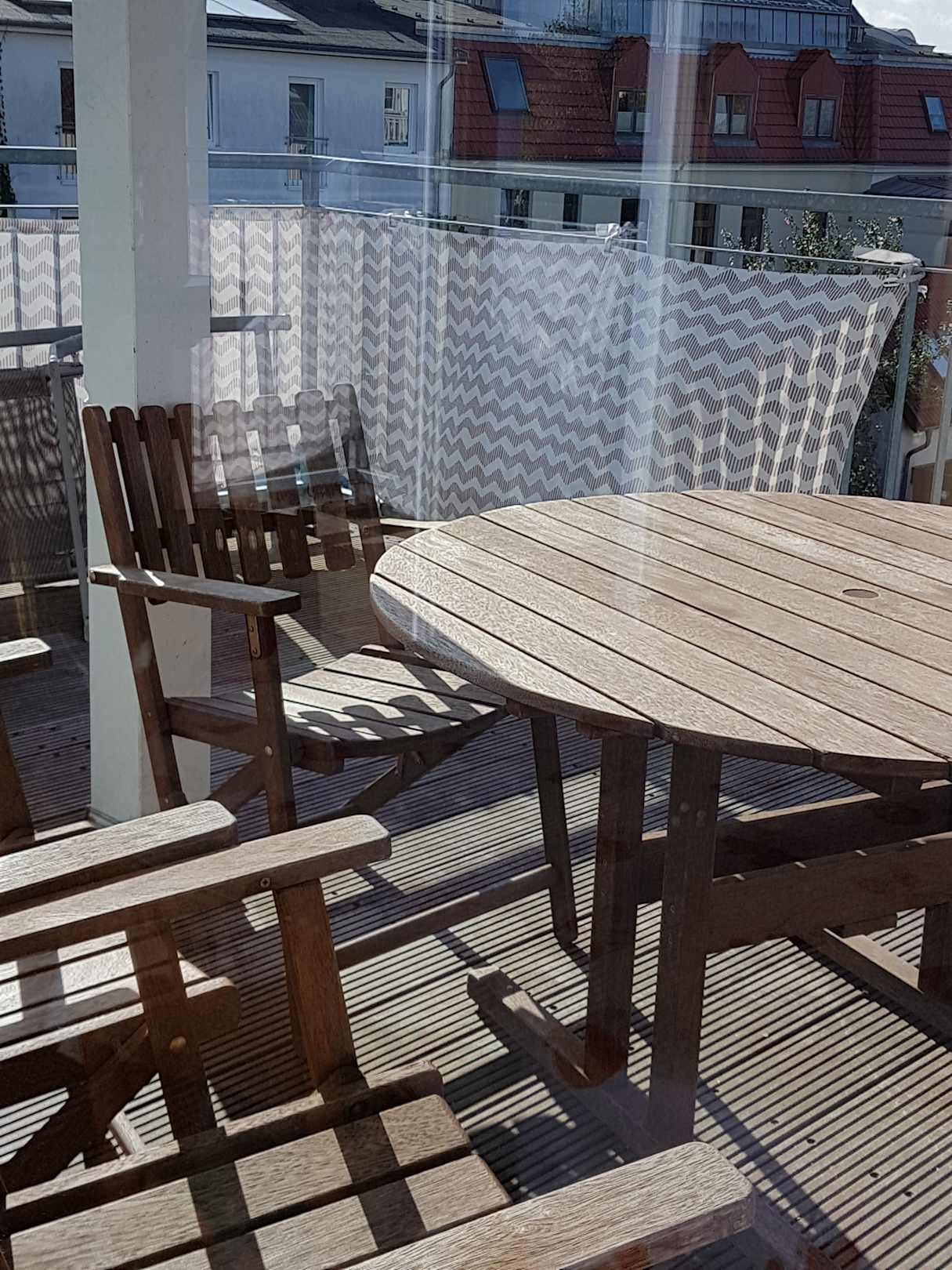 Sitzgruppe auf der Terrasse, von innen fotografiert.