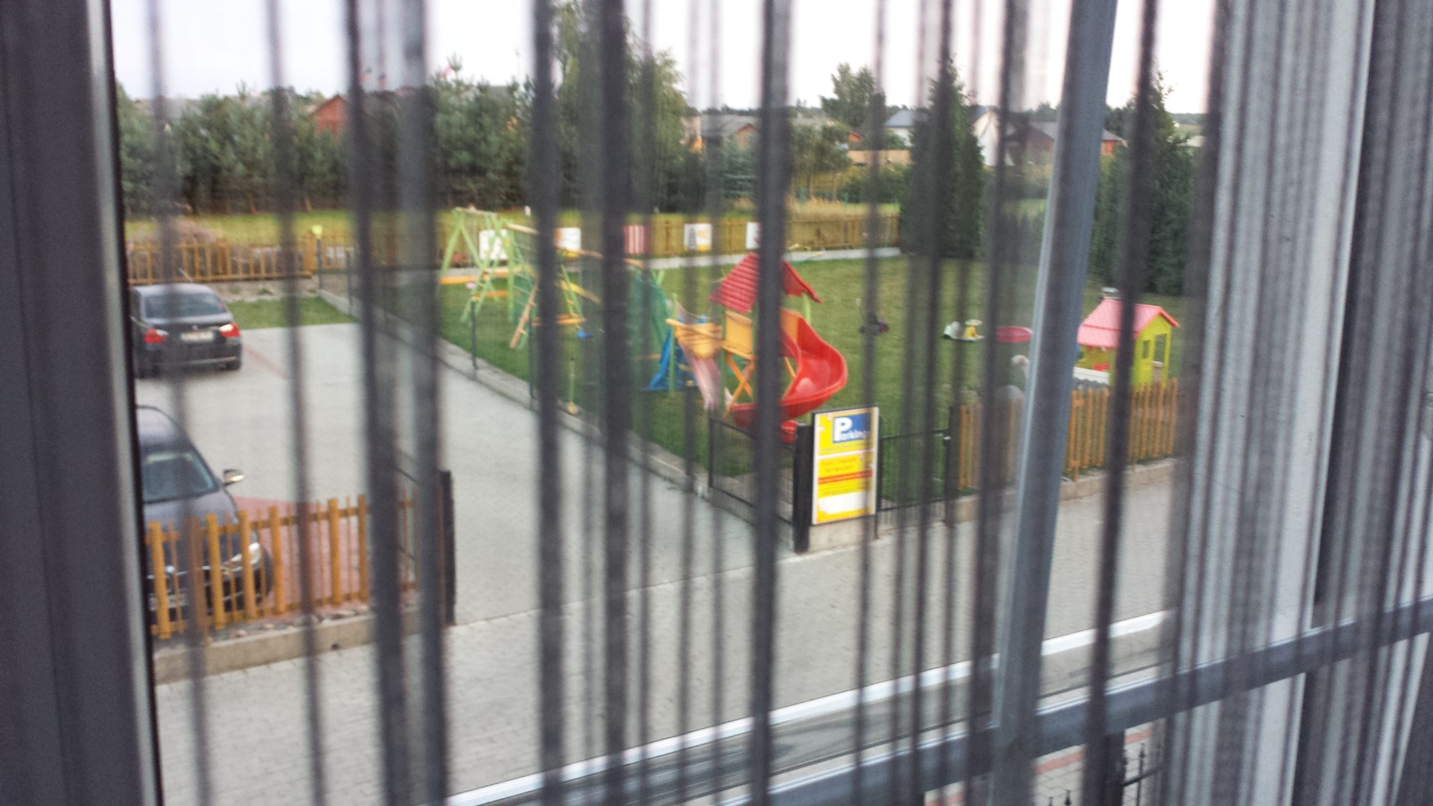 links Parkplatz, rechts Spielplatz