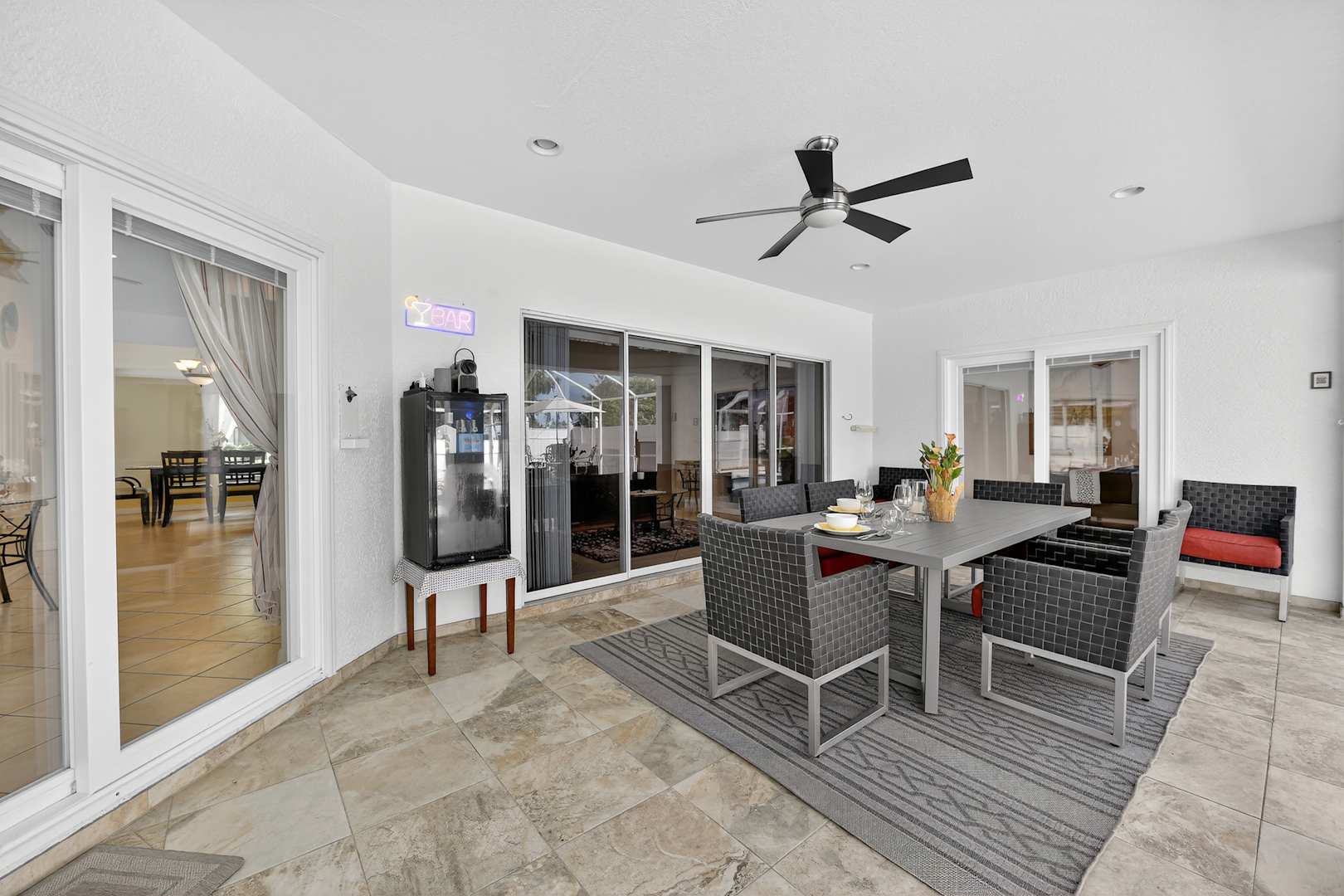 PoolÜberdachte und wettergeschützte Lanai mit Aussenkühlschrank, moderne und bequeme Möbel in der Villa FloridaDream