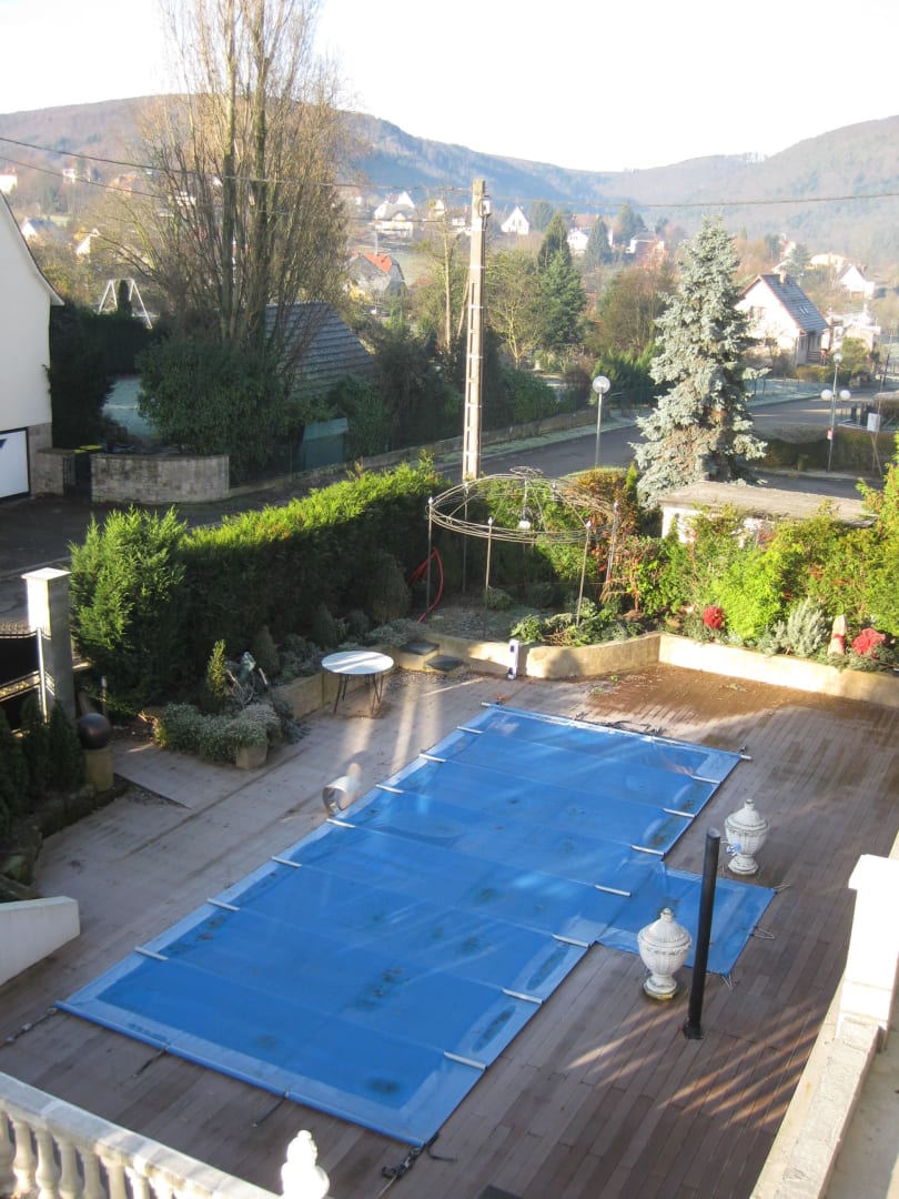 Blick auf den Pool vom Zimmer im Winter