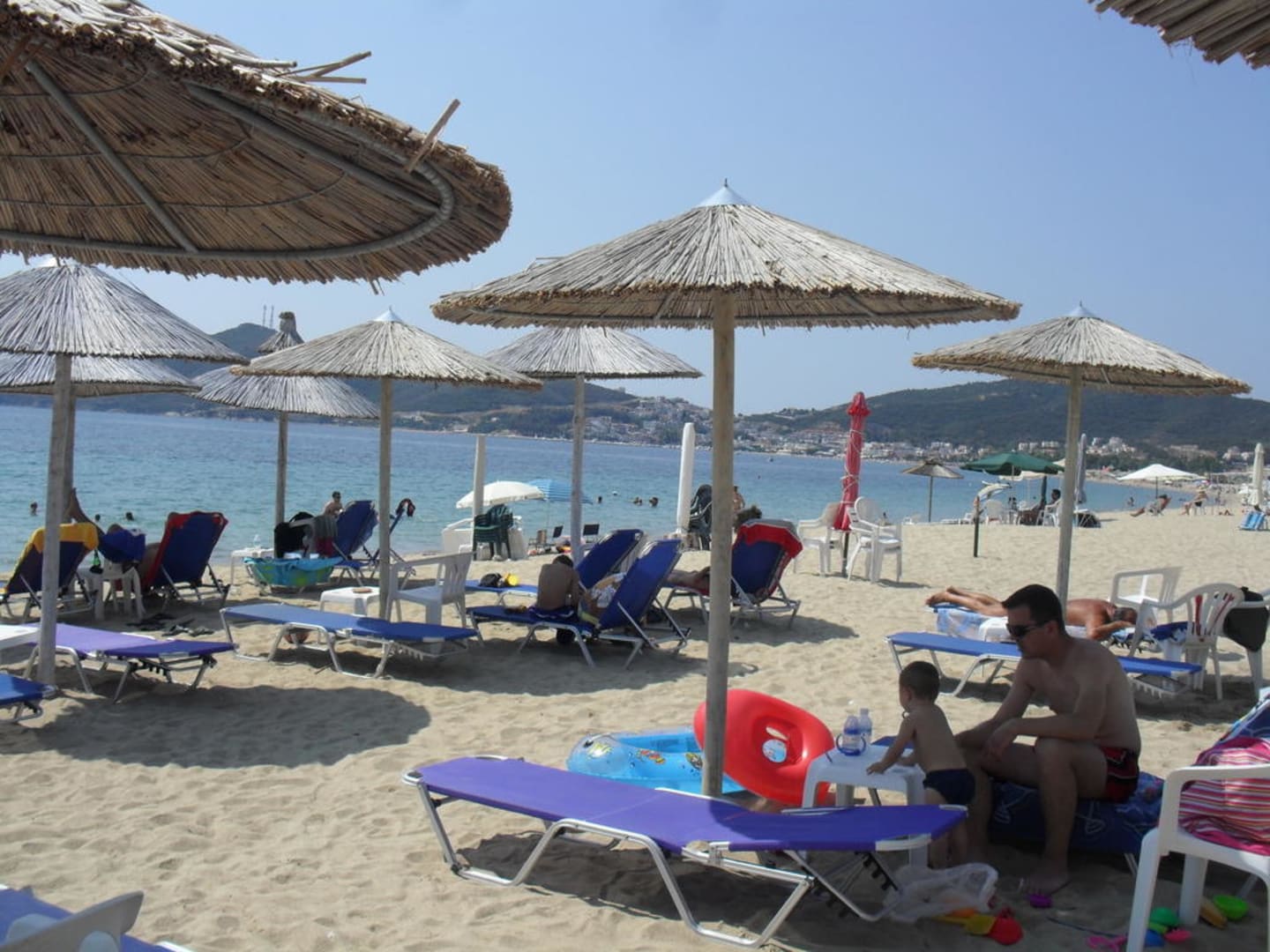Liegen mit Schirmen fast umsonstdie liegen waren nie ausgebucht, es war genug platz für familien u.vorwiegend pensionisten (meistens aus griechenland)