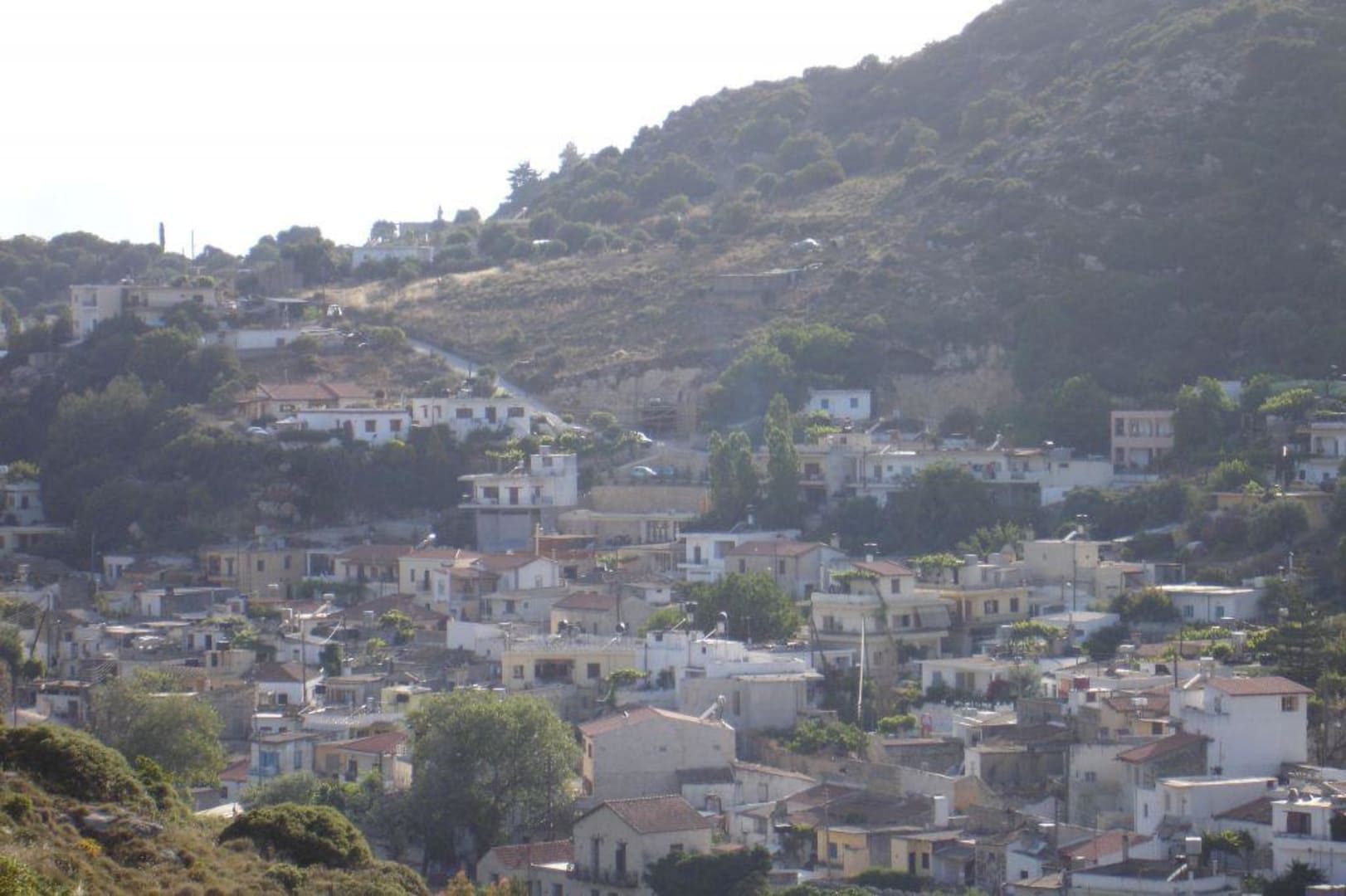 Im Hintergrund von links oben kommt die Zufahrtsstraße an. In der Bildmitte befindet sich der Parkplatz, darunter die Taverne, schräg links vor ihr der Poolbereich. Der Zimmertrakt ist weiter unten hinter anderen Häusern versteckt.