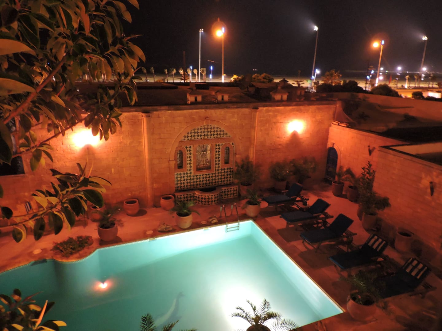 Vue de nuit sur la piscine et la plage