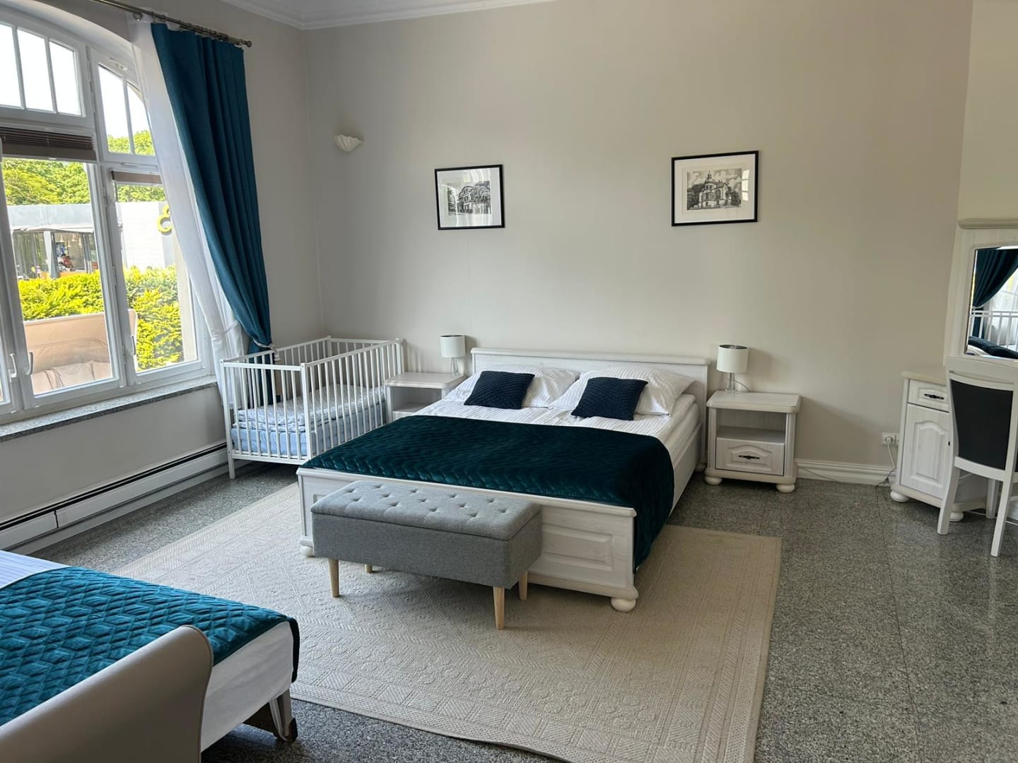 Schlafzimmer mit Schlafsofa und Babybettchen
