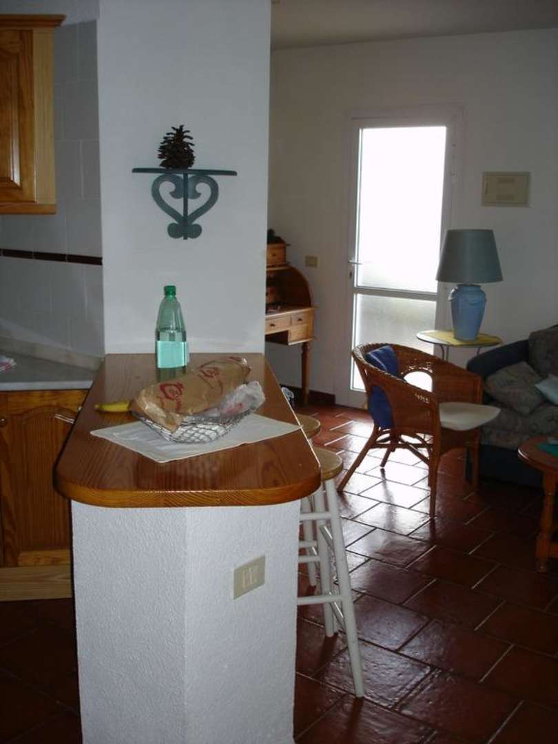Küchentheke mit Blick auf Eingang des Apartments