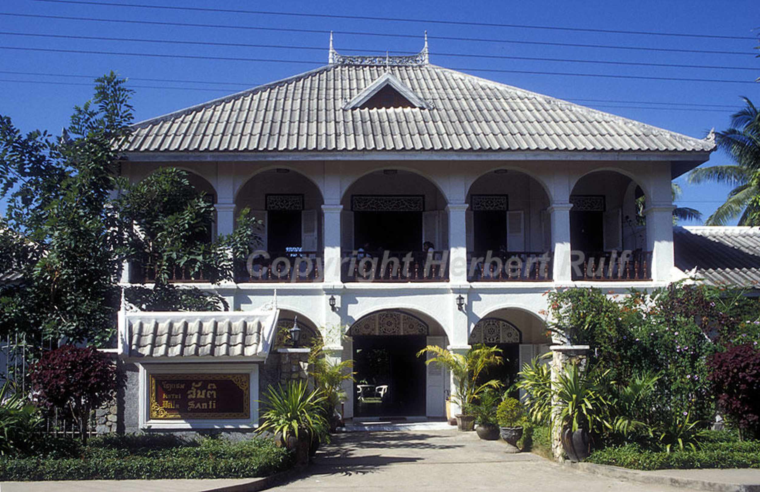 Hauptgebäude der Villa SantiDas wohl stilvollste Hotel in Luang Prabang. Es ist die ehemalige Villa der königlichen Prinzessin. Hier im Hauptgebäude sind nur wenige Gästezimmer, die meisten Zimmer befinden sich in Nebengebäuden im Garten.