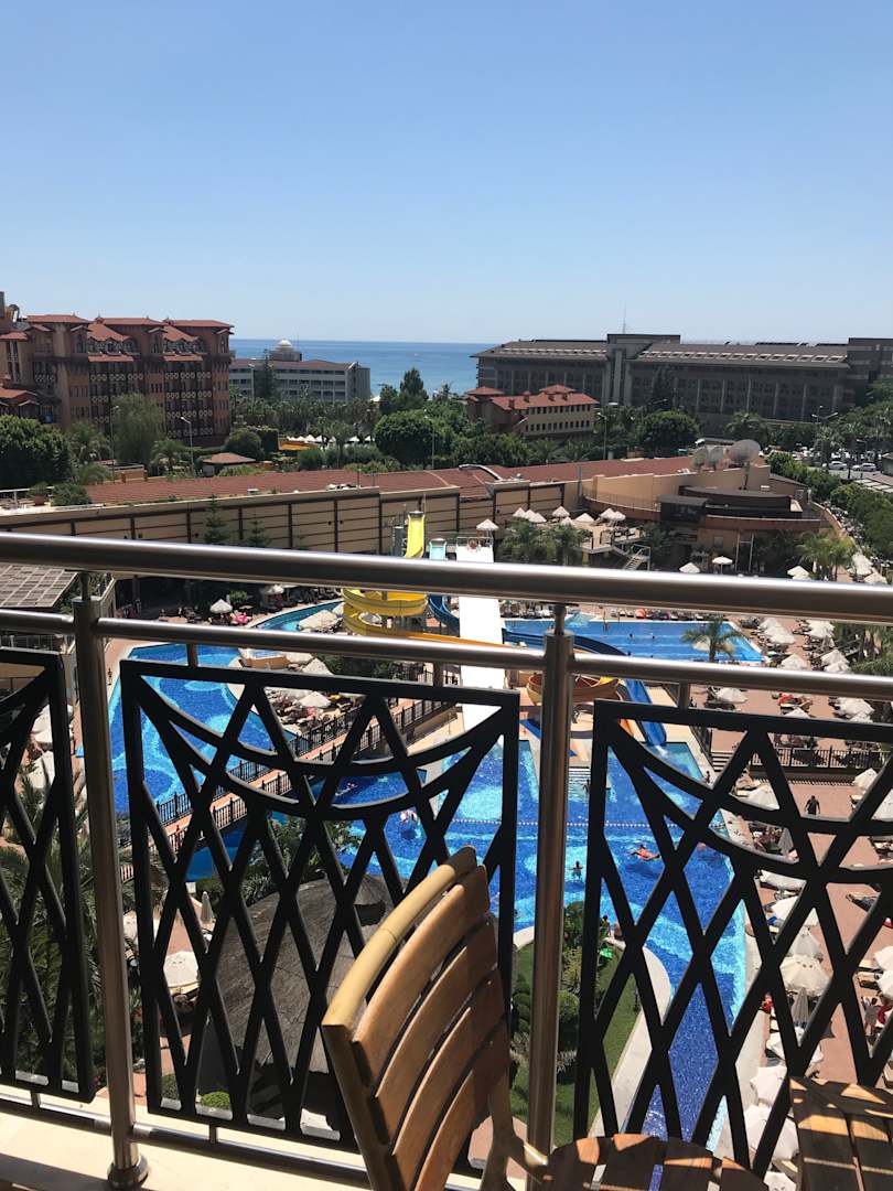 AusblickGegen Aufpreis (90€ für 2 Personen) am Anreisetag vom Standardzimmer in die 4. Etage mit Meer- und Poolblick gewechselt.