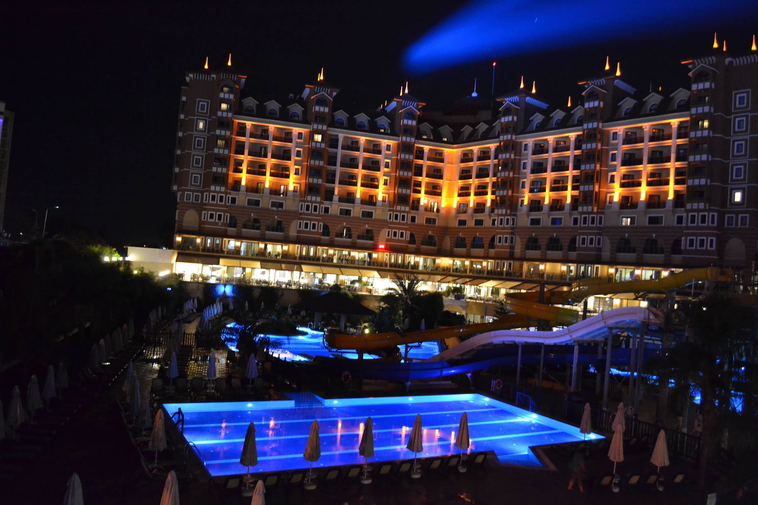 Poolanlage und Hotel nachts