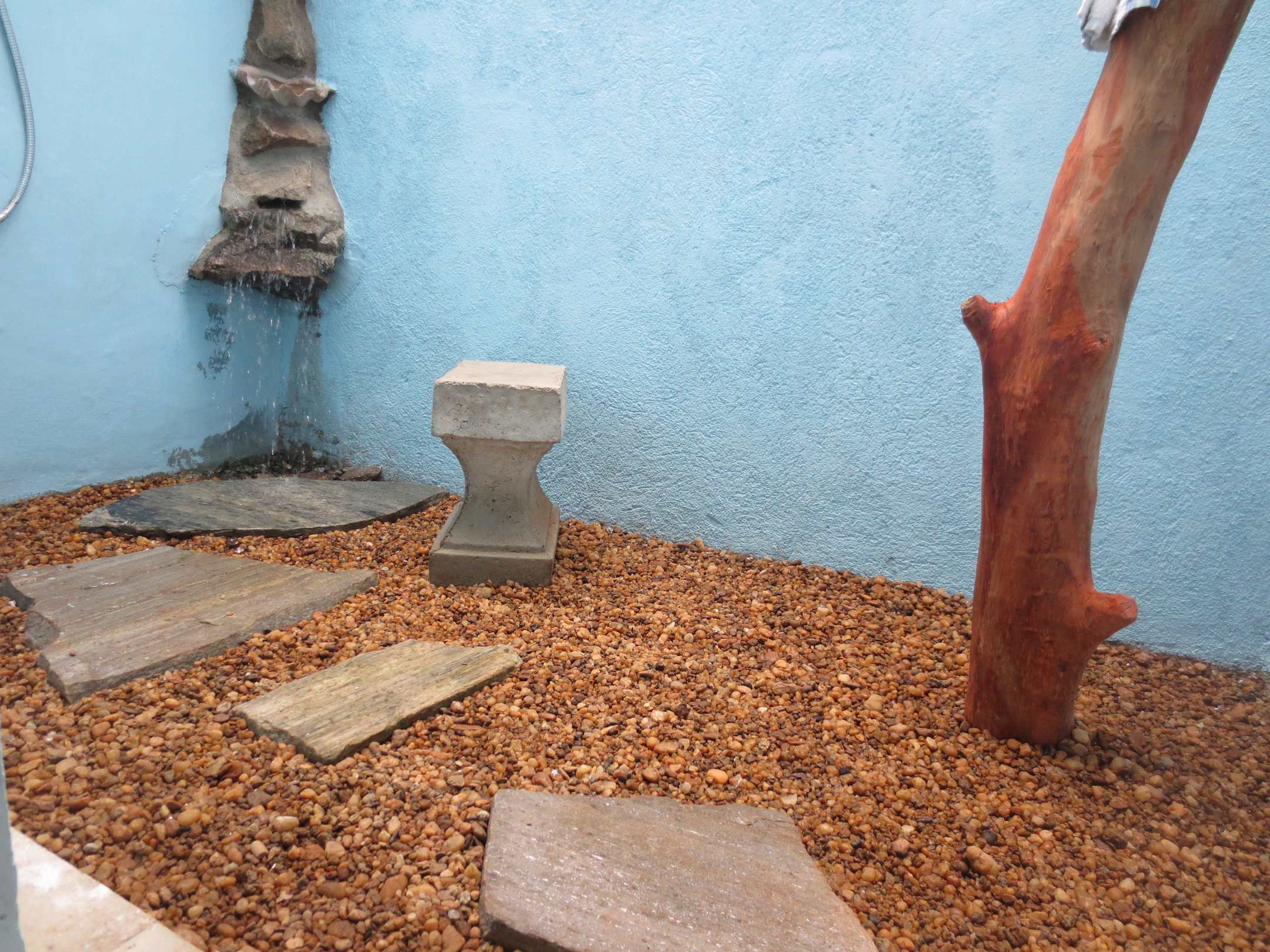 AußenduscheAußendusche Fußboden aus Kies mit Natursteinplatten, hinten in der Ecke eine Fußdusche mit Sitzhocker