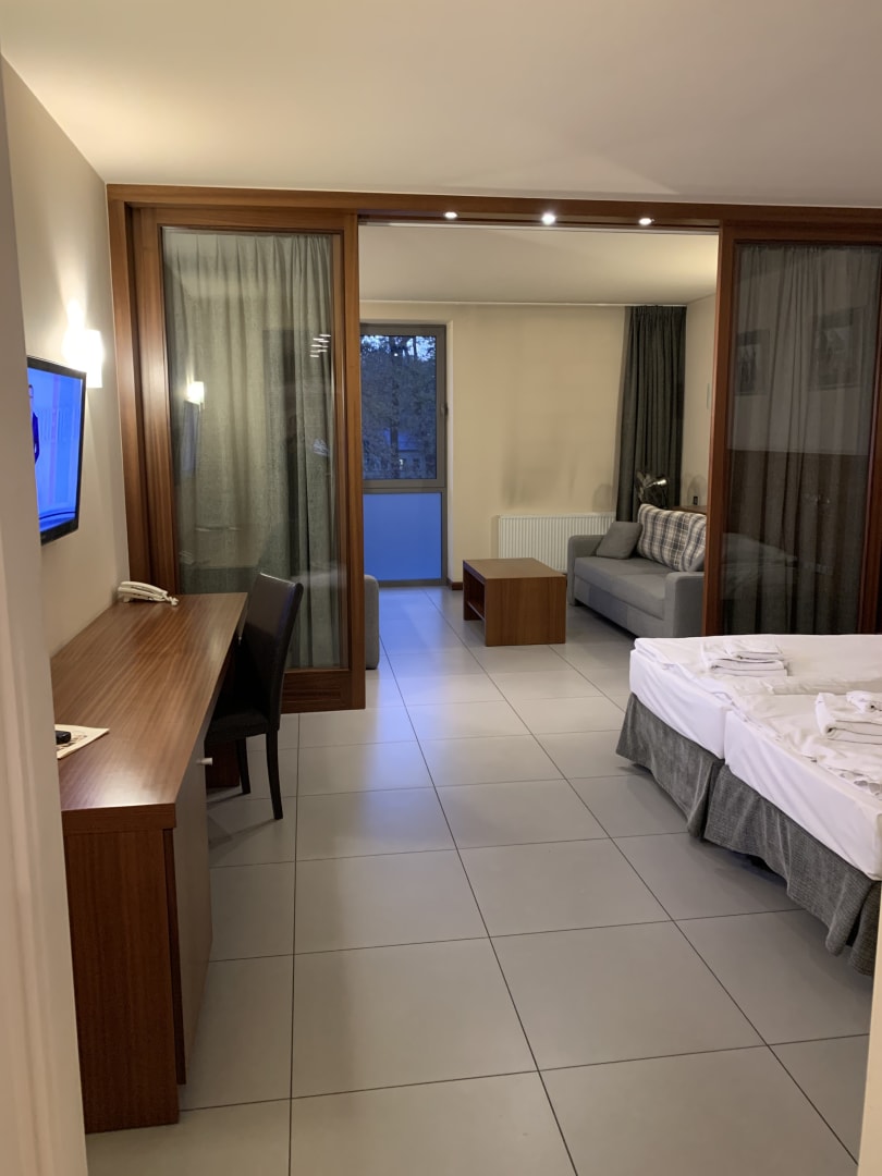 ZimmerDie Wand (hinten) ist wohl nur wegen der Heizung so, ansonsten war das Zimmer sehr sauber und gepflegt, vor allem aber groß!