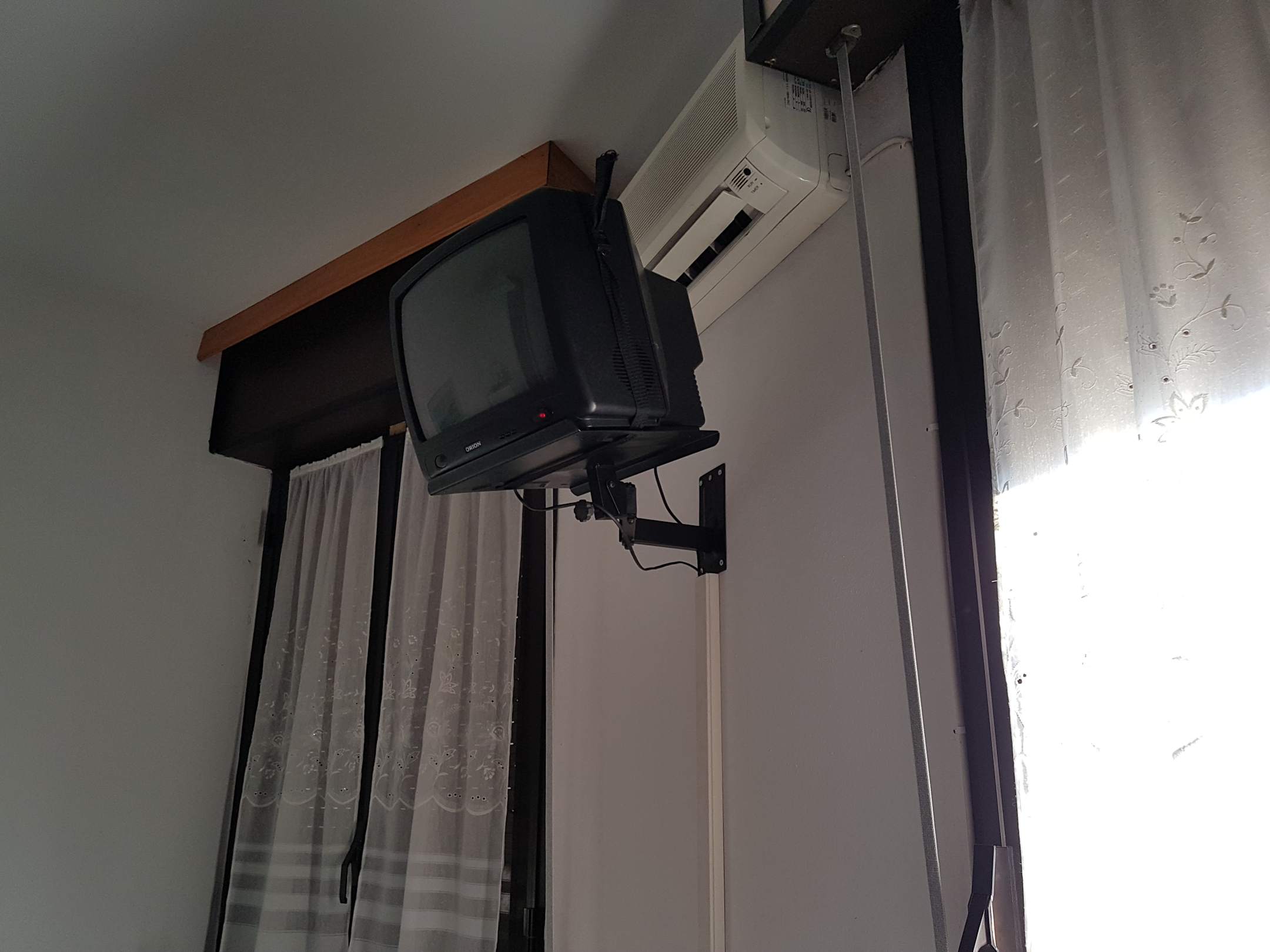 Veralteter Fernseher und defekte Klimaanlage, Wasser tropft an der Wand herunter...