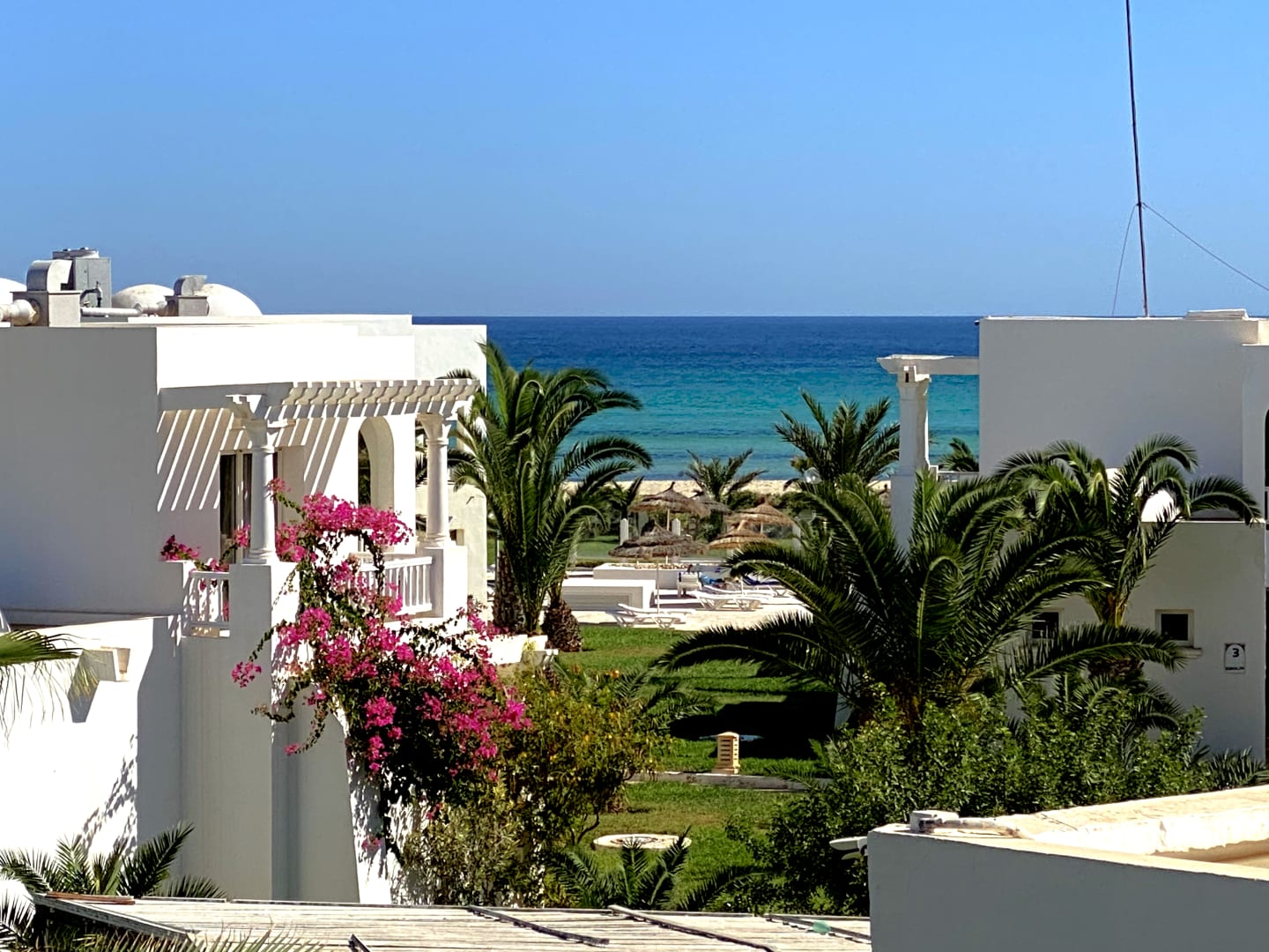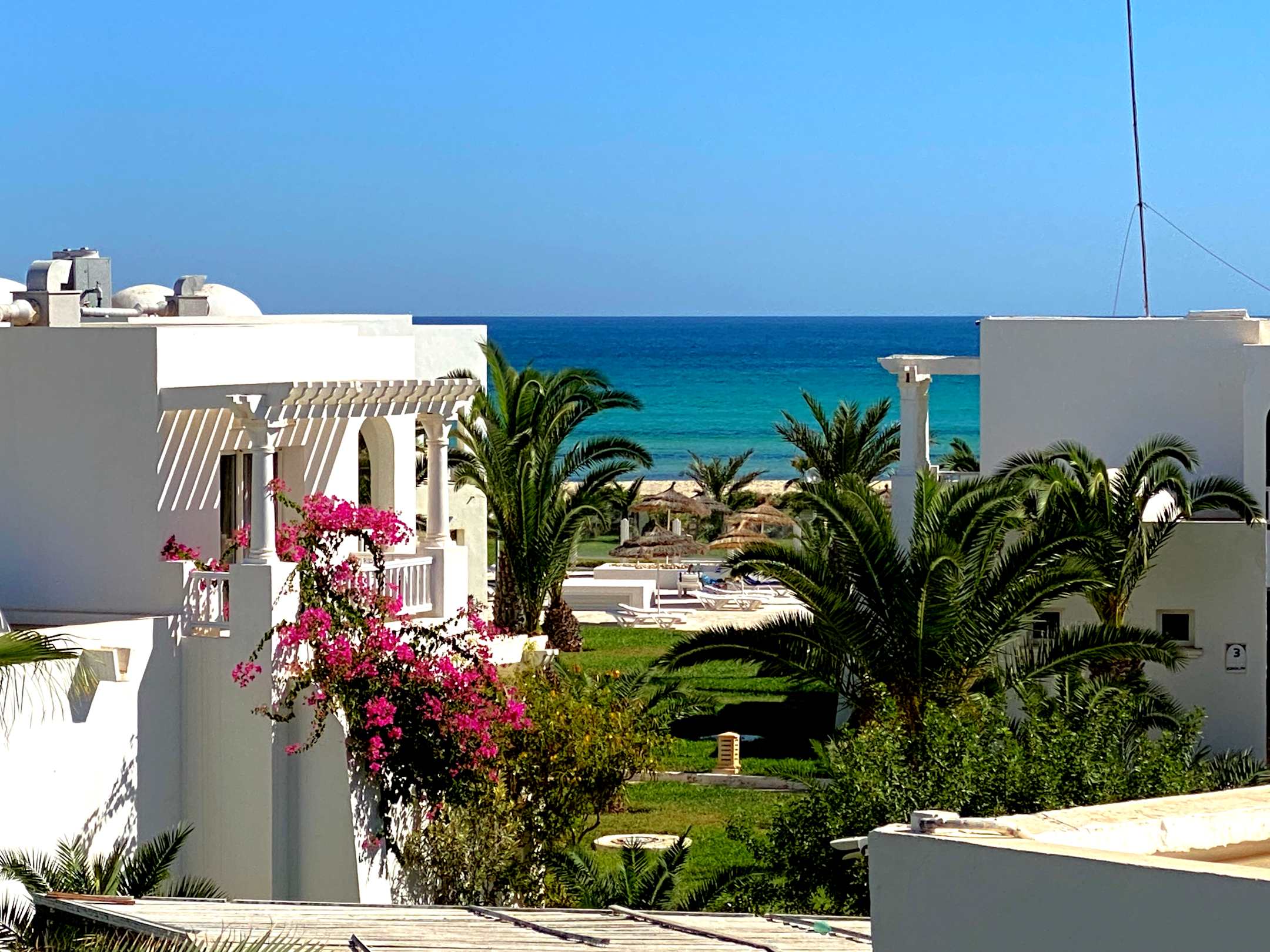 Blick zum Strand/Meer vom Zimmer aus dem Haupthaus