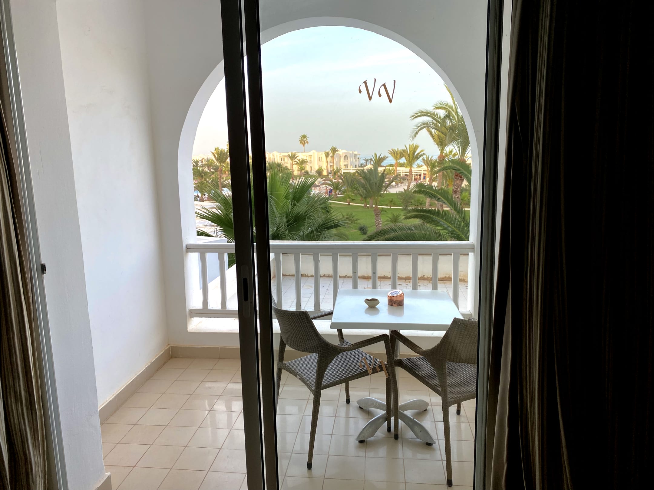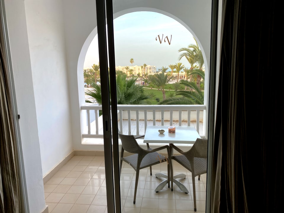 Balkon mit Blick auf die Poolanlage und das Meer