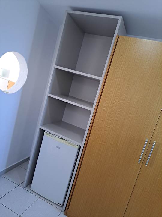 das Regal war die einzige Möglichkeit um was abzulegen-da der Kleiderschrank nur 2 kleine -Schubladen hatte und eine Kleiderstange-alles sehr veraltet-Kühlschrank war auch sehr alt und auch nicht sauber