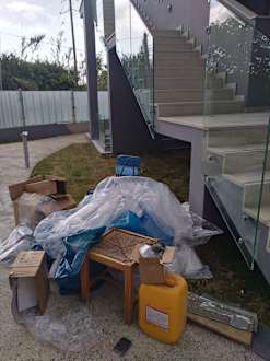 Fehlende Glasplatten im Geländer, Müllablage im Treppenbereich