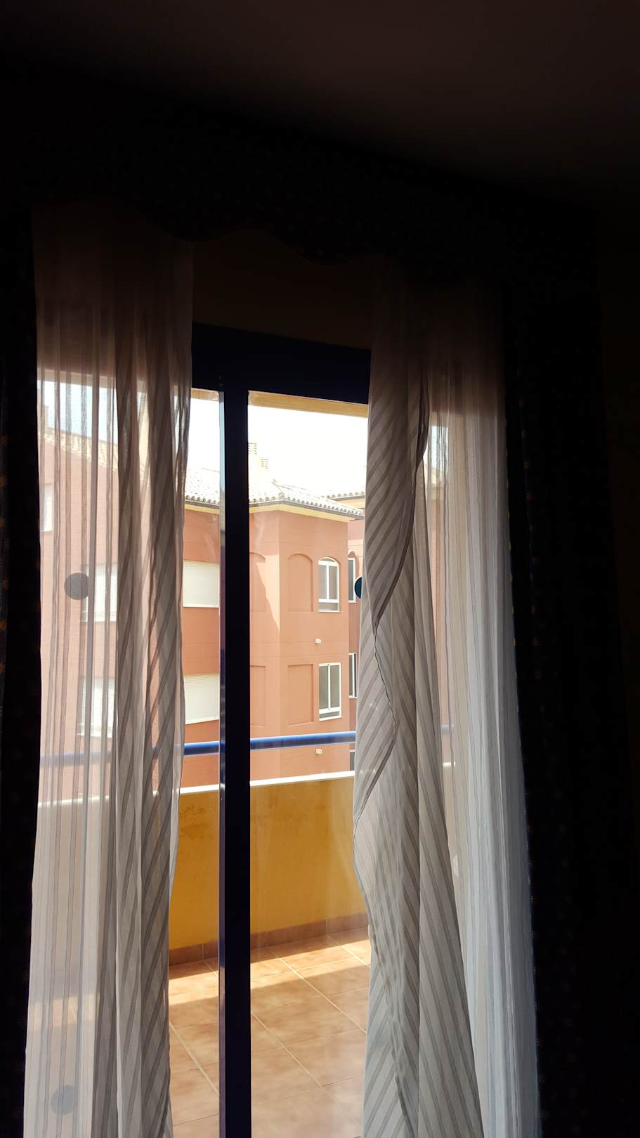 ZimmerGardinen sind abgerissen, vergilbt und Boden schwarz vor Dreck