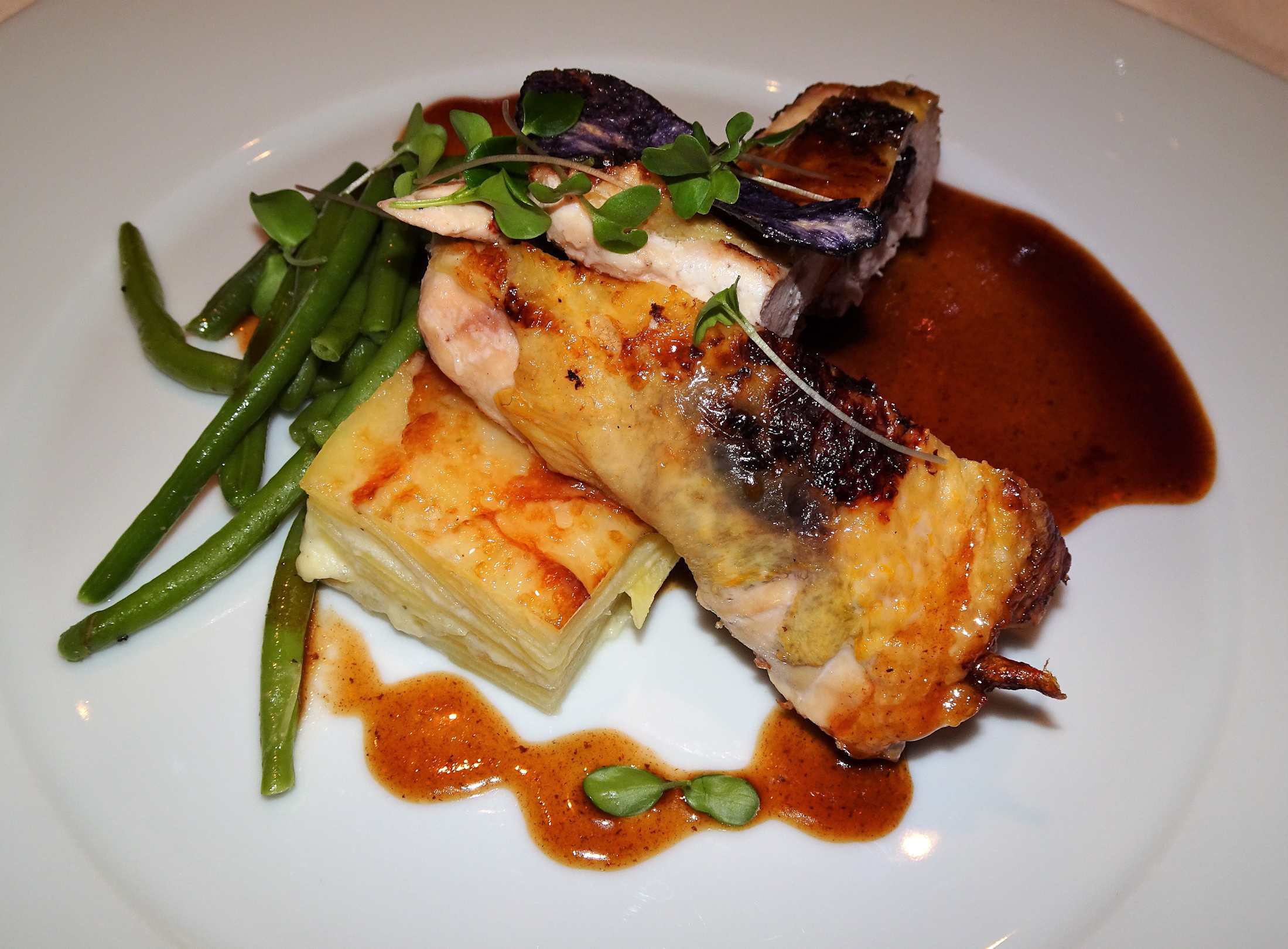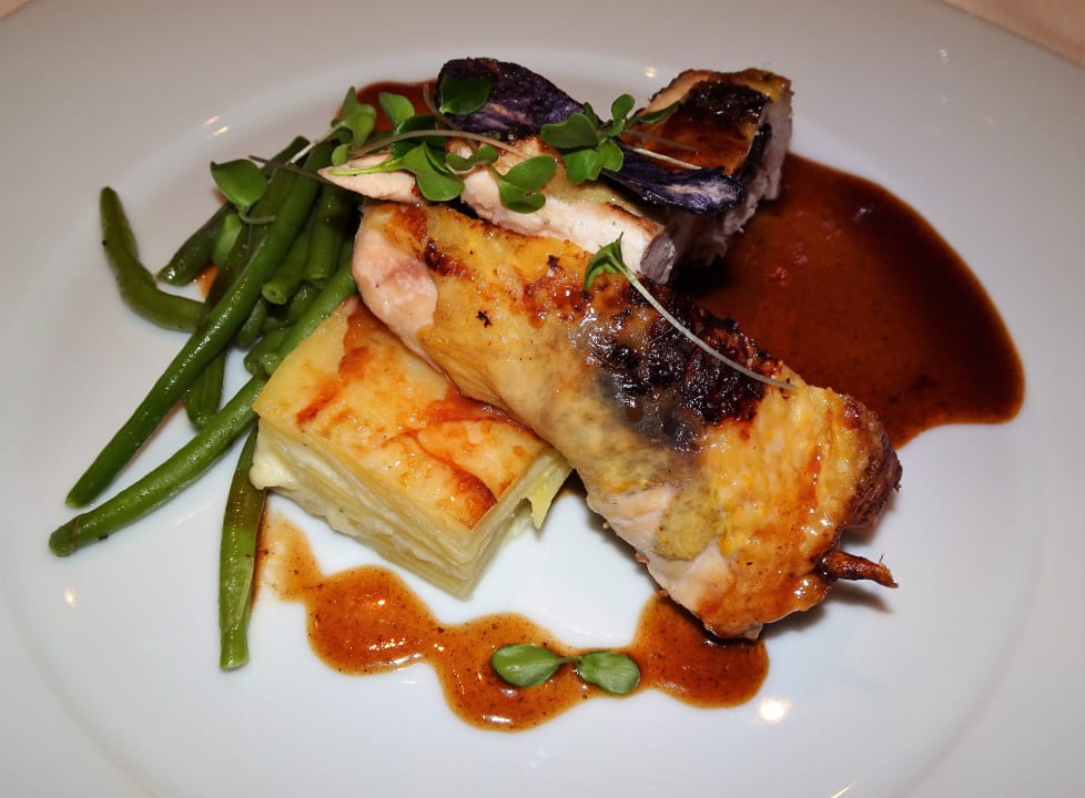 GastroAbendessen im Hotel Dosses: Gefüllte Perlhuhnbrust mit Armagnac-Pflaumen auf Gratinkartoffeln mit grünen Bohnen