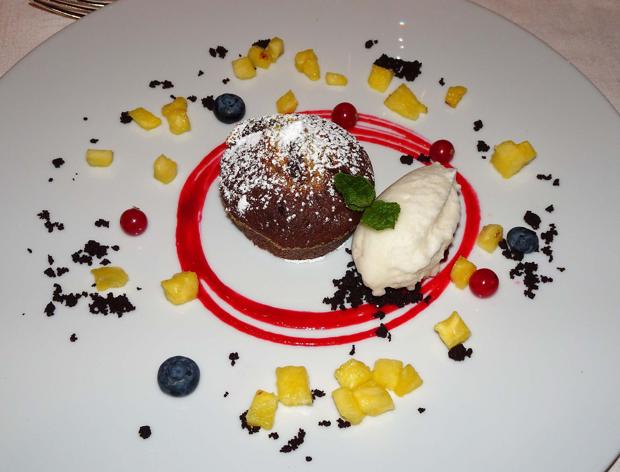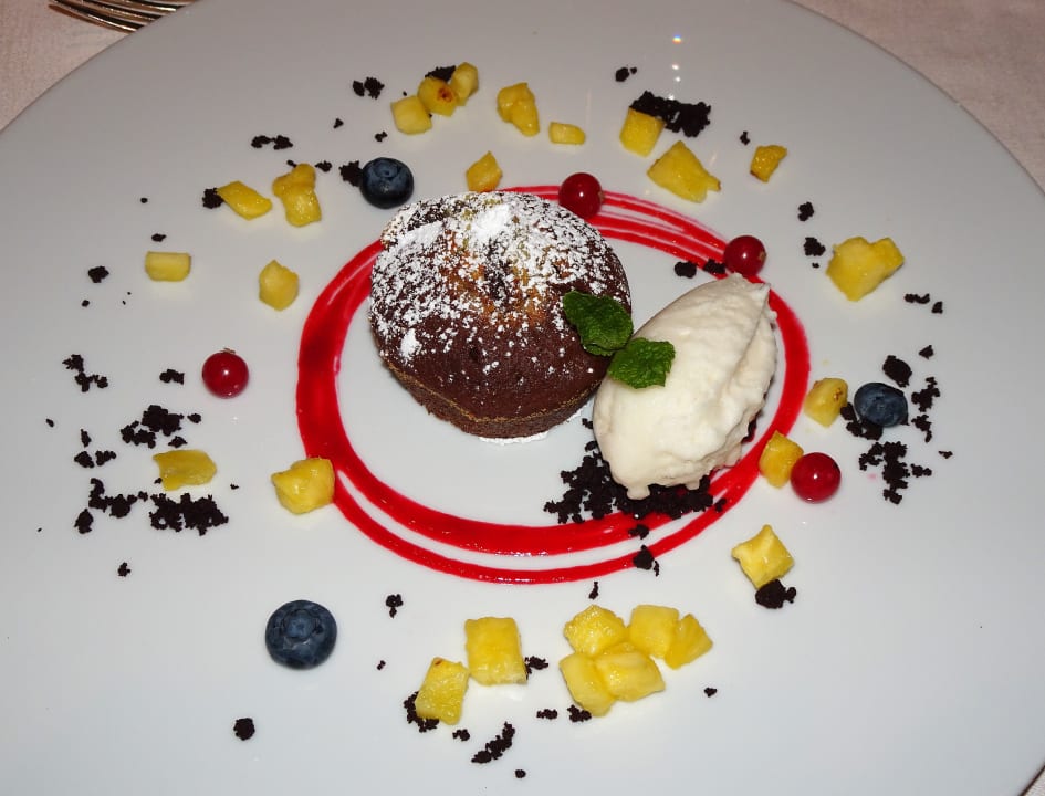 Abendessen im Hotel Dosses: Marmoriertes Schokoladentörtchen mit Ananas und Wacholdersorbet