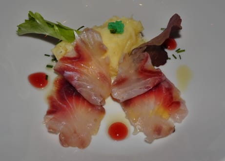 GastroAbendessen im Hotel Dosses: Gebeizter Schattenfisch mit Kartoffeln, Meerrettich und Granatapfel
