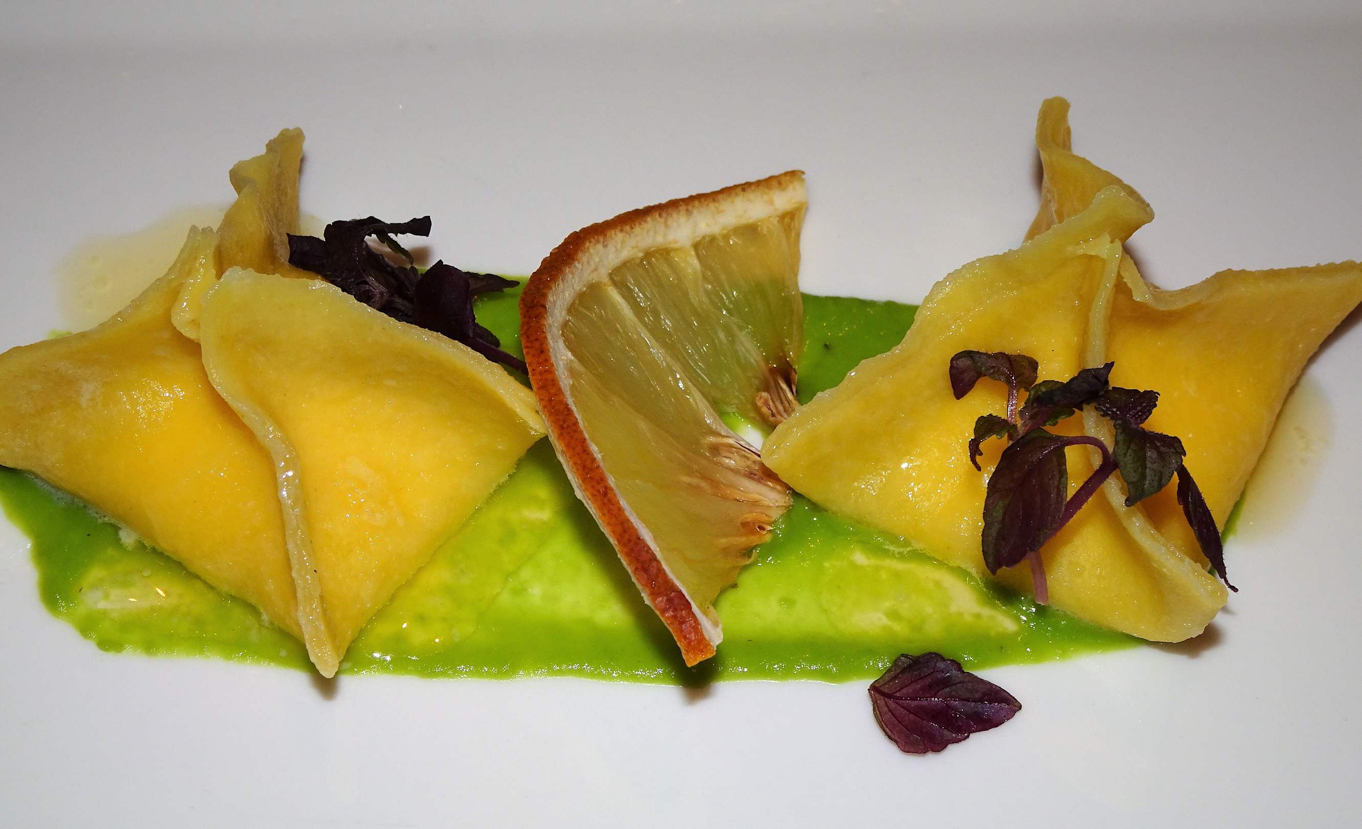 Abendessen im Hotel Dosses: Parmesanteigtaschen mit Erbsencreme und Zitronenbutter